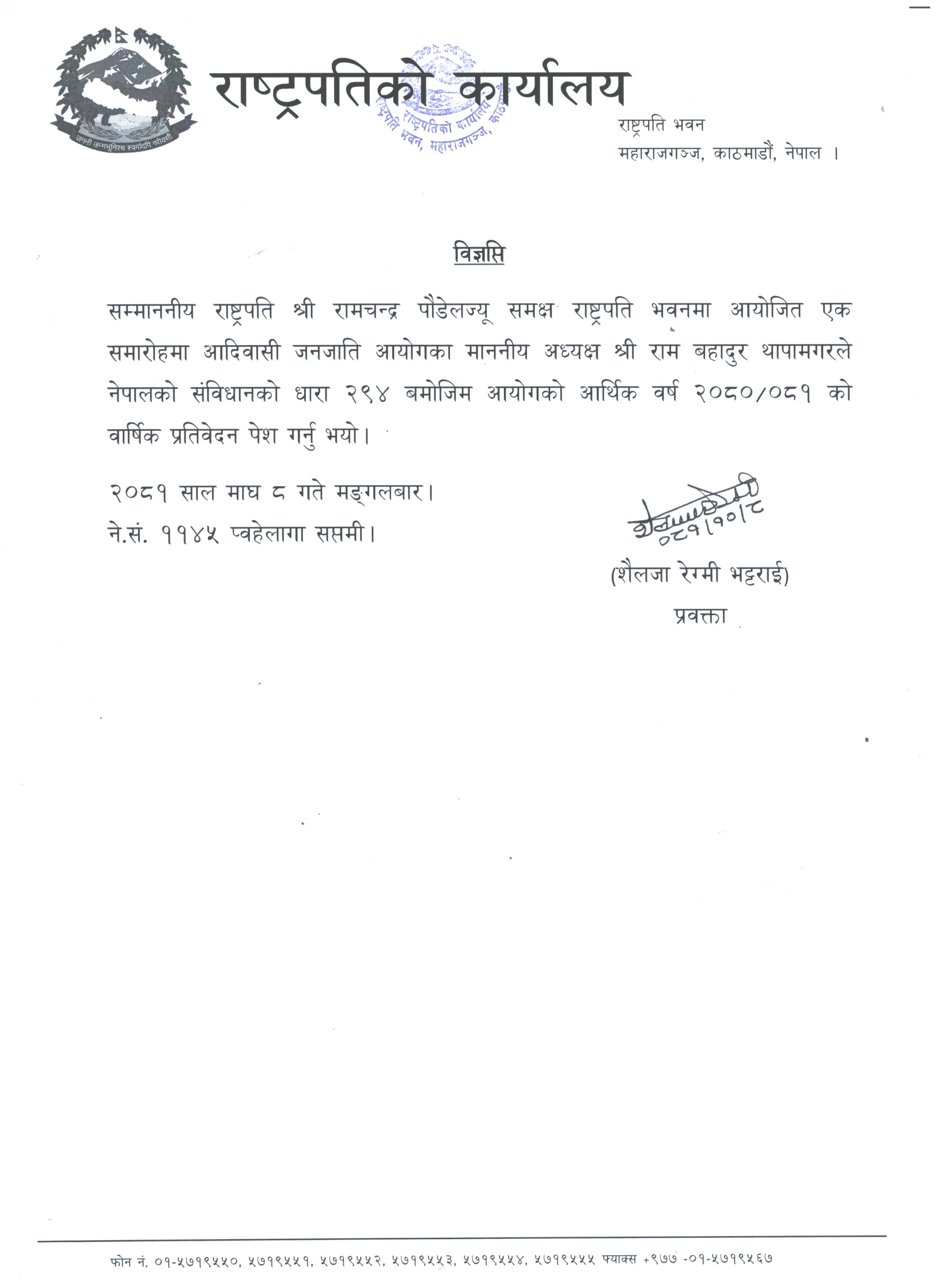 मंगलबार राष्ट्रपति भवनमा आदिवासी जनजाति आयोगका अध्यक्ष रामबहादुर थापामगरले राष्ट्रपति पौडेलसमक्ष वार्षिक प्रतिवेदन पेश गरेका हुन्।