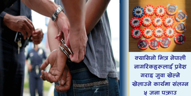 काठमाडौं । नेपाली नागरिकलाई गैरकानुनी रूपमा जुवा खेलाउने कार्यमा संलग्न पाँच जनालाई प्रहरीले पक्राउ गरेको छ। प्रहरीले काठमाडौंको बुढानिलकण्ठ तौलुङस्थित गरुड क्यासिनोबाट उनीहरूलाई नियन्त्रणमा लिएको हो।
