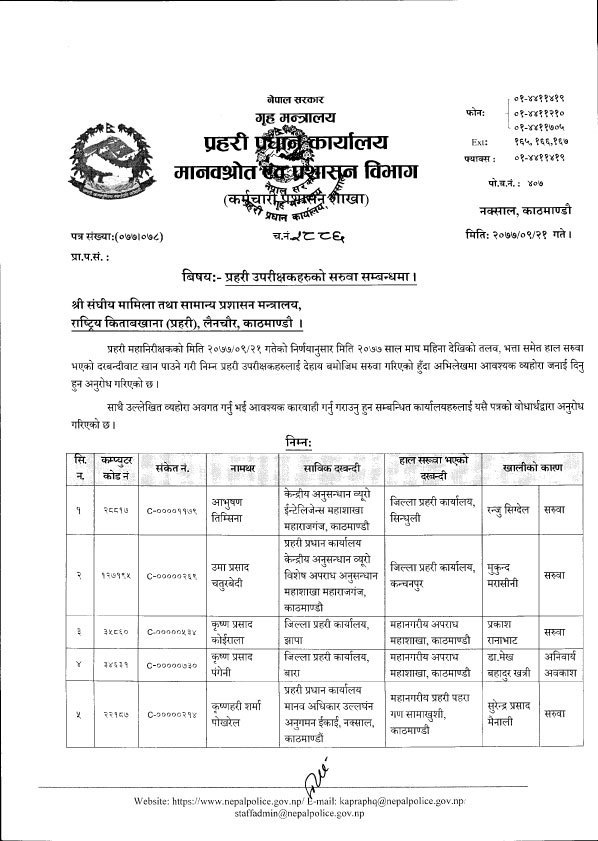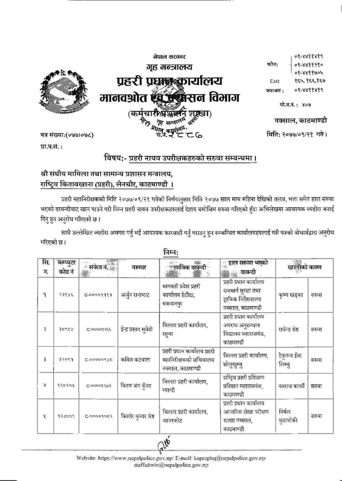 काठमाडौं । नेपाल प्रहरीका प्रहरी उपरिक्षक (एसपी) र प्रहरी नायव उपरिक्षक (डीएसपी) हरुको सरुवा गरिएको छ ।