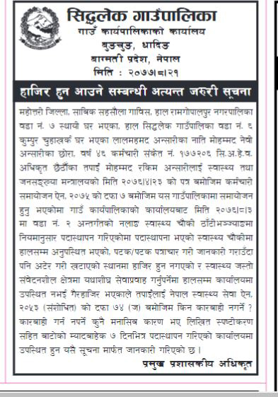 गाउँपालिकाको कुम्पुर स्वास्थ्य चौकीमा कार्यरत सिनियर अहेव (छैटौँ तह) रकिम अन्सारीलाई नलाङ स्वास्थ्य चौकीमा हाजिर नभएको भन्दै गत मंसिर २१ गते गोरखापत्रमा सुचना छापिएको थियो । तर, उक्त समयमा प्रमुख प्रशासकीय अधिकृत धनेश्वर पौडेल सरुवा भएका थिए । उनको ठाउँमा आउनुपर्ने हालका प्रमुख प्रशासकीय अधिकृत नन्दलाल शर्मा समेत हाजिर भएका थिएनन् ।
