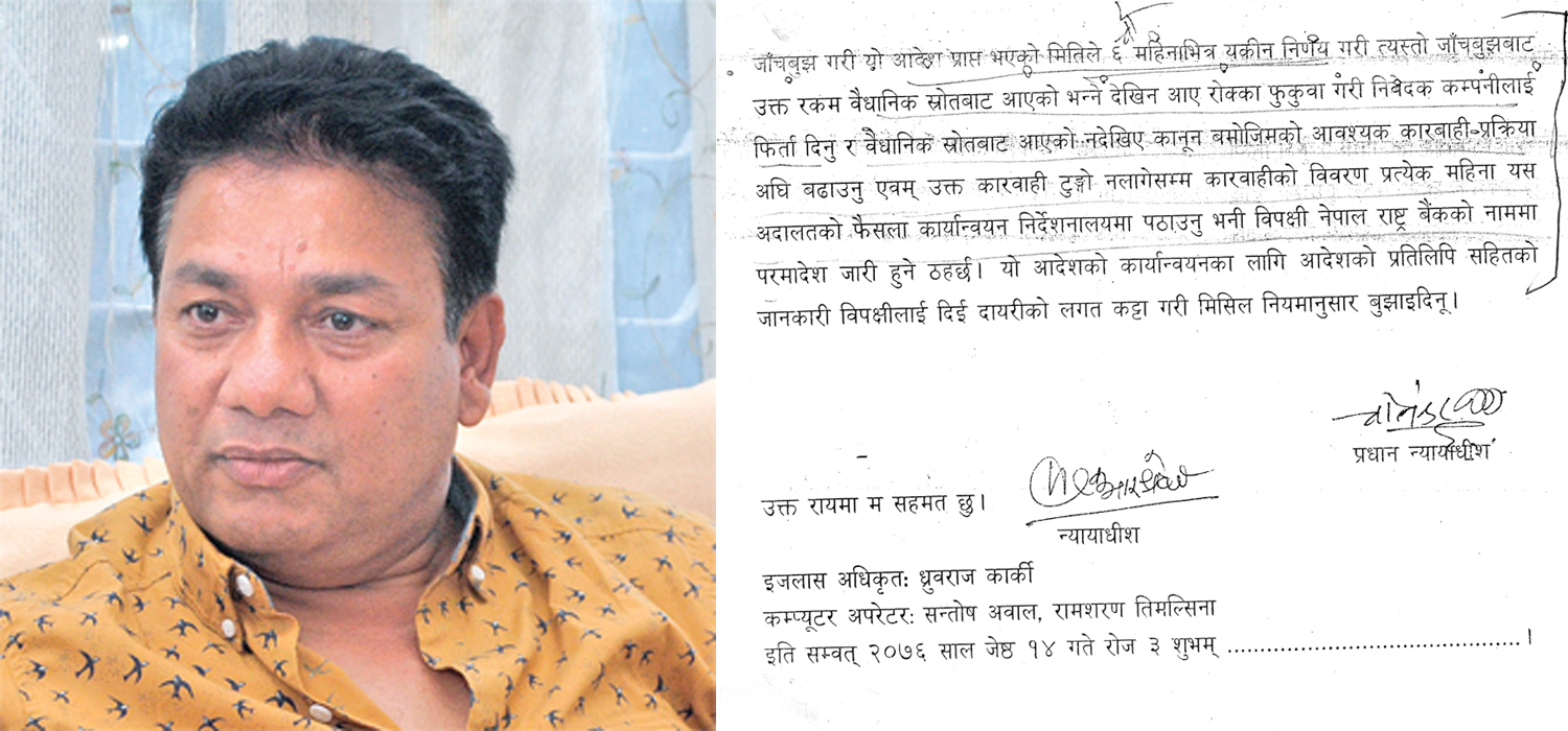 भन्ने सम्बन्धमा जाँचबुुझ गरी यो आदेश प्राप्त भएको छ महिनाभित्र एकीन निर्णय गरी त्यस्तो जाँचबुुझबाट उक्त रकम वैधानिक स्रोतबाट आएको भन्ने देखिन आए रोक्का वा फुकुुवा गरी निवेदक कम्पनीलाई फिर्ता दिनुु र वैधानिक स्रोतबाट आएको नदेखिए कानुुनबमोजिमको आवश्यक कारबाही प्रक्रिया अघि बढाउनुु एवं उक्त कारबाही टुुंगो नलागेसम्म कारबाहीको विवरण प्रत्येक महिना यस अदालतको निर्देशन कार्यान्वयनमा पठाउनुु भनी विपक्षी नेपाल राष्ट्र बैंकको नाममा परमादेश जारी हुुने ठहर्छ, फैसलामा भनिएको छ ।