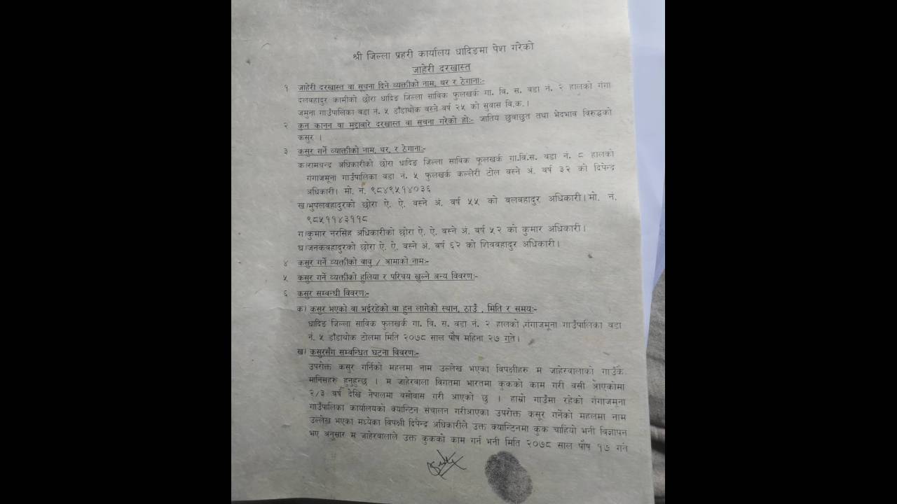 धादिङ । धादिङको गंगाजमुना गाउँपालिकामा भएको छुवाछुत तथा विभेदको घटनामा समलग्न नै नभएको एक बृद्धको नाम समेत जाहेरीमा परेको पाइएको छ । ७० वर्षिय शिव बहादुर अधिकारीको नाम जाहेरीमा उल्लेख भएको पाइएको हो । उनी घटनामा समलग्न नै नभएपनि राजनीतिक प्रतिसोधकै आधारमा फसाउने उद्देश्यले नाम समावेश गरिदिएको उनको दाबी छ ।