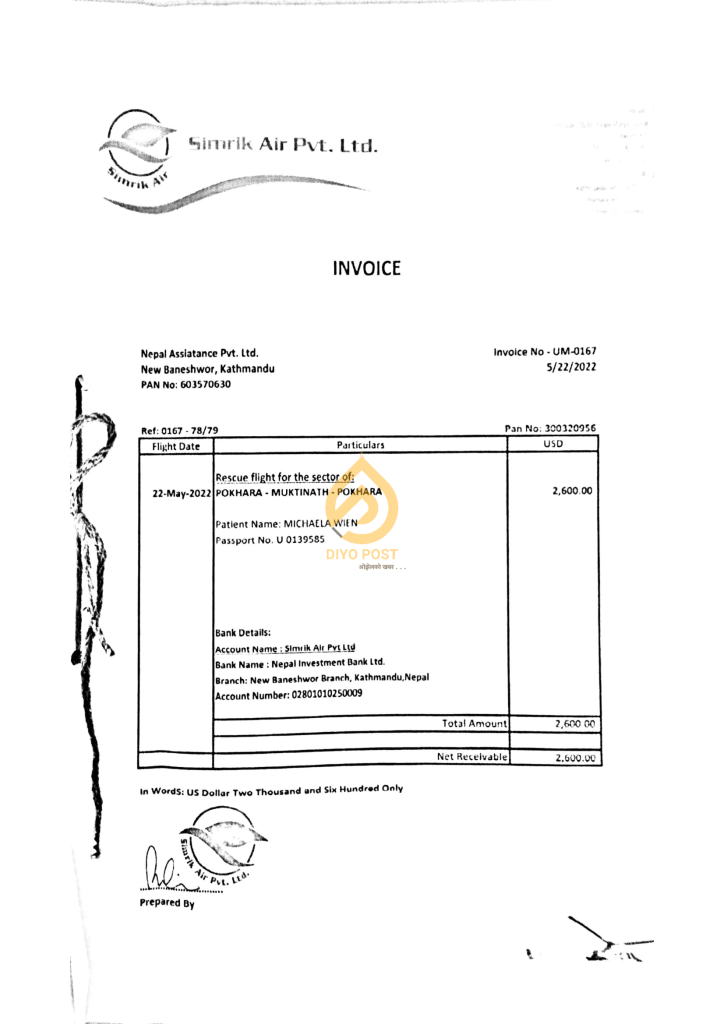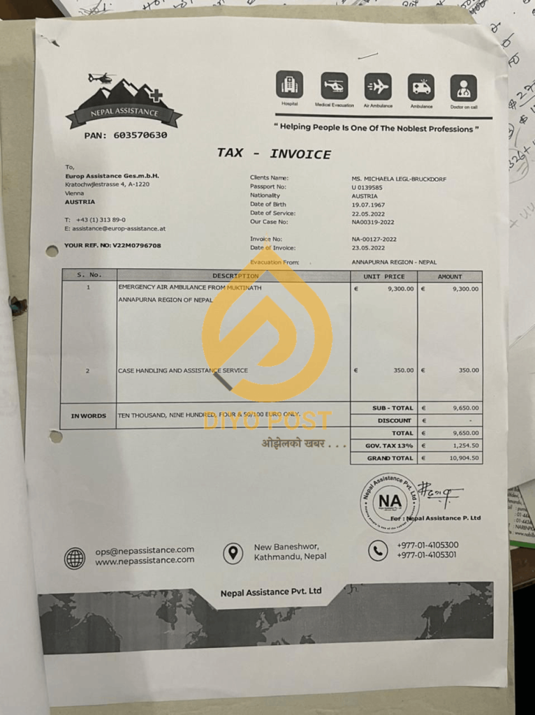 ढकालले नै उपलब्ध गराएको अर्को बिलमा सोही विरामी उद्दार गरेबापत युरोप एसिएस्टेन्सलाई ५ हजार ५ सय युरो भुक्तानी दाबी गरिएको छ । हेलिकोप्टरले लिएको शुल्क भन्दा यो दोब्बर शुल्क हो ।