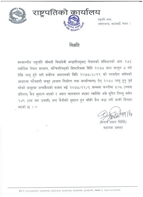 मन्त्रिपरिषद्को सिफारिसमा उनिहरुको कैद माफी मिनाहा गरेको हो । राष्ट्रपतिले प्रजातन्त्र दिवस, गणतन्त्र दिवसलगायतका अवसरमा कैदीबन्दीको कैद मिनाहा माफी गर्न पाउने कानूनी व्यवस्था रहेको छ ।