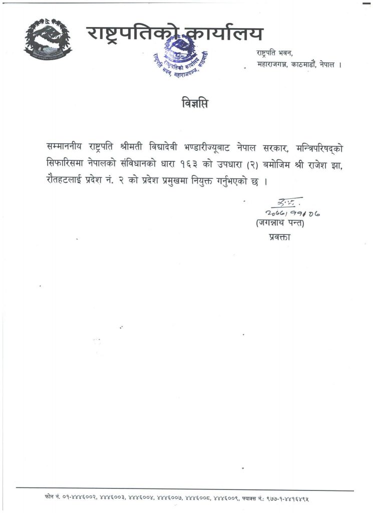 उनलाई हटाएर प्रदेश प्रमुखमा प्रधानमन्त्री ओलीको सर्मथनमा युटयुभ तथा टेलिभिजनमा बोल्ने राजेश अहिराज (झा)लाई प्रदेश प्रमुख बनाइएको छ ।