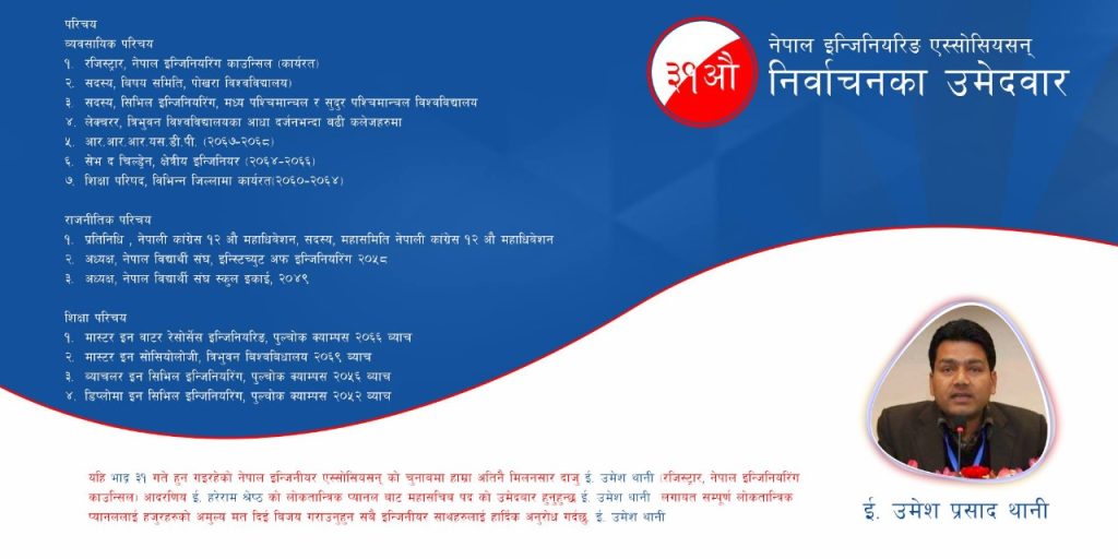 निर्देशिकामा इन्जिनियरिङ शब्द घुसाइएपनि कार्याअनुभवको आधारमा उनको योग्यता नपुग्ने स्रोतको दाबी छ । उनले नेपाल इन्जिनियरिङ एशोशियशनको निर्वाचनमा आफ्नो चुनावी प्रचार सामग्री बनाएका थिए । सोही सामग्री अनुसार उनको व्यावसायीक परिचयमा उनी नेपाल इन्जिनियरिङ काउन्सिलको रजिष्टार, पोखरा विश्व विद्यालयको विषय समिति सदस्य, सेभ द चिल्ड्रेन नामक एनजिओको क्षेत्रीय इन्जिनियर, नेपाली कांग्रेसको महासमिति सदस्य लगायत राजनीतिक परिचय उल्लेख गरिएको छ । त्यस्तै नेपाली कांग्रेस निकट संस्था सेन्टर फर डेमोक्रयाटिक इन्जिनियर्स नेपाल सिडेनको अध्यक्षको उम्मेदवारको रुपमा भोट माग्दा भने उनले नेपाल विद्युत प्राधिकरणको बोर्ड सदस्य, नेपाल इन्जिनियर्सको एशोसिएशनको पूर्व महासचिव इन्जिनियर काउन्सिलको पूर्व रजिष्टार र एभरेष्ट इन्जिनियर कलेजको प्रिन्सिपल हुँ भन्दै भोट मागेका थिए ।