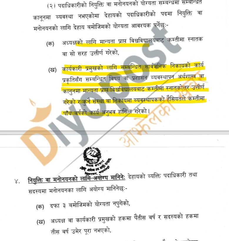 यसअघिको निर्देशिकाको दफा ३ ख मा कार्यकारी प्रमुखको योग्यता सम्बन्धी व्यवस्थालाई सुटुक्क परिवर्तन गरिएको हो । यसअघिको निर्देशिकाको उक्त दफामा ‘ कार्यकारी प्रमुखको लागि सम्बन्धित सार्वजनिक निकायको कार्य प्रकृतिसँग सम्बन्धित विषय वा प्रशासन व्यवस्थापन अर्थशास्त्र वा कानुनमा मान्यता प्राप्त विश्व विद्यालयबाट कम्तिमा स्नातकोत्तर उत्तिर्ण गरेको र कुनै संस्था वा निकायमा व्यवस्थापकको हैसियतले कम्तीमा ५ वर्षको कार्यअनुभव हासिल गरेको’ भन्ने उल्लेख थियो ।