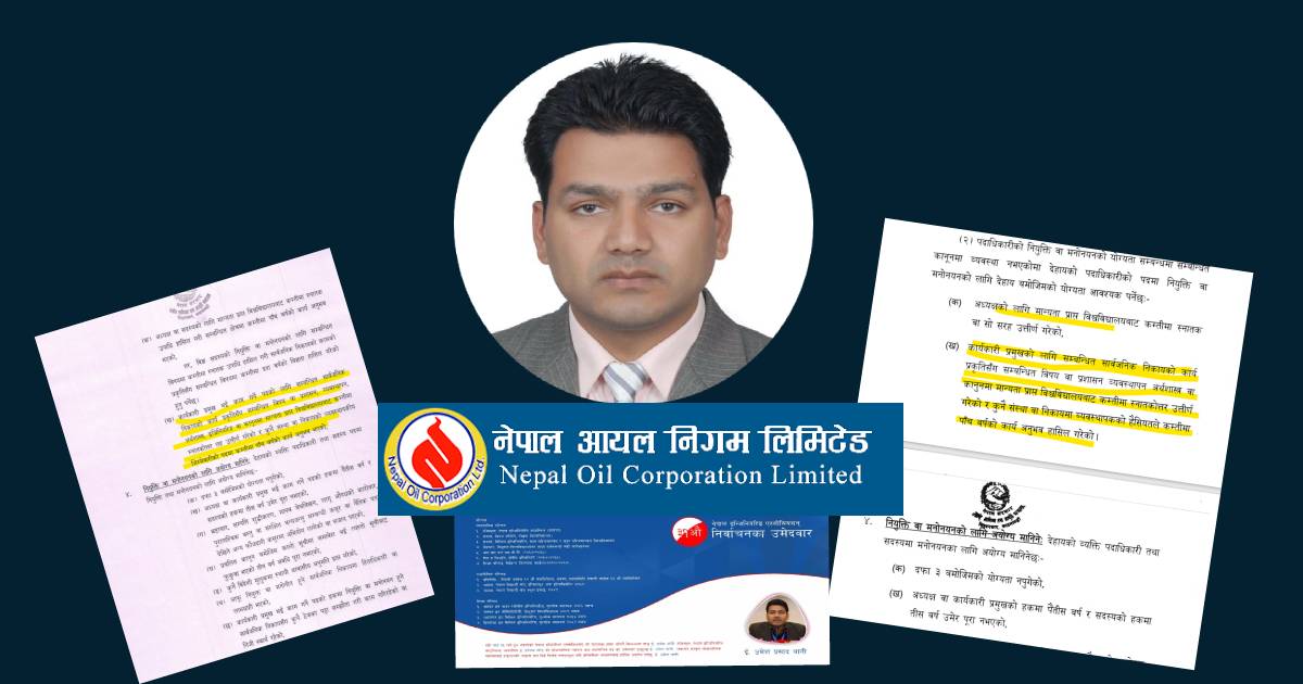 काठमाडौं । नेपाल आयल निगमको कार्यकारी निर्देशकमा अयोग्य व्यक्तिलाई नियुक्त दिलाउन सुटुक्क निर्देशिका नै परिवर्तन गरेको खुलाशा भएको छ । उद्योग वाणिज्य तथा आपूर्ति मन्त्री समेत रहेका प्रधानमन्त्री शेर बहादुर देउवाले कांग्रेस निकट व्यक्तिलाई कार्यकारी निर्देशक नियुक्त गर्न निर्देशिका नै परिवर्तन गरेको पाइएको हो ।