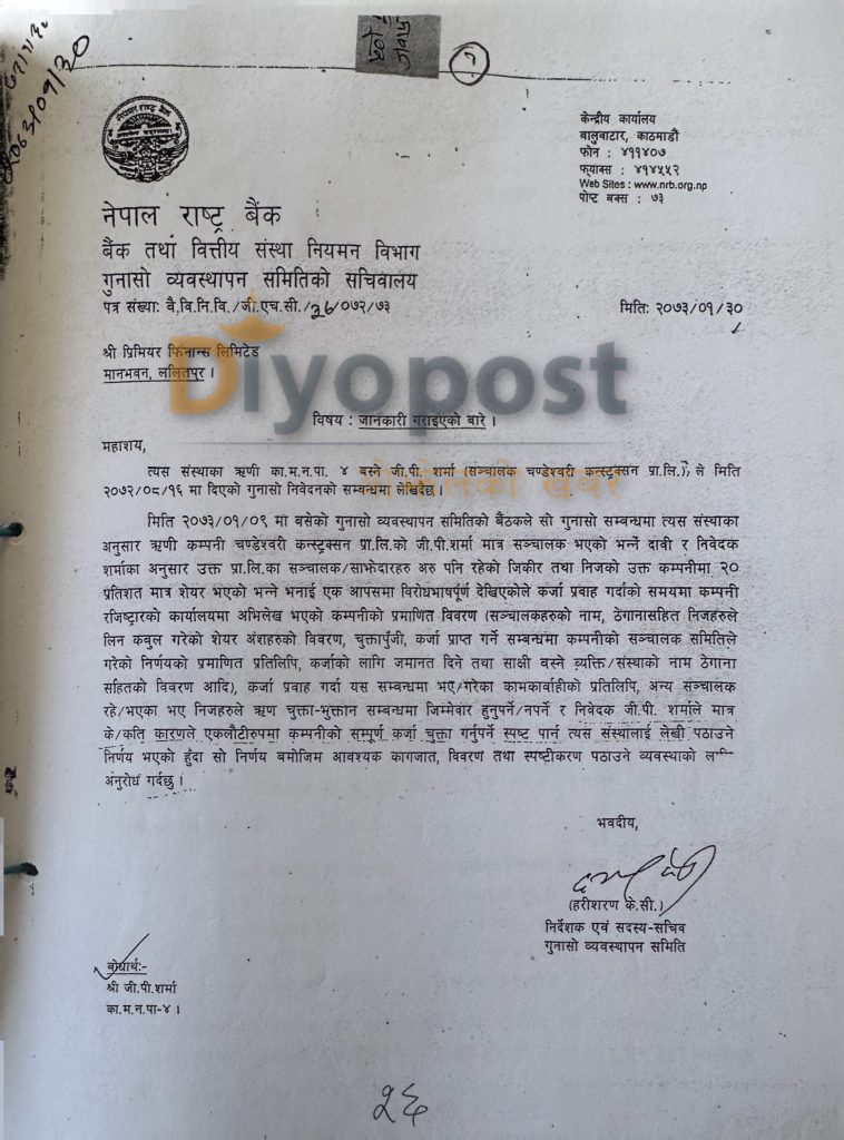 म लिलामी विरुद्ध उजुरी लिएर राष्ट्र बैंक पुगेँ । त्यतिबेला राष्ट्र बैंकले ‘ऋणी श्रीजिपी शर्माले मात्रै किन तिर्नुपर्ने ? अन्य ऋणीले किन तिर्नुनपर्ने ? भनेर प्रश्न गरिदियो । त्यतिबेला लिलामी गर्दा एकल शेयरधनी भनेर मेरो मात्रै नामको जग्गा खाने नियत राखिएको थियो । मलाई त्यो चिठी चित्त बुझेको थियो । राष्ट्र बैंकले न्याय गर्दोरहेछ भन्ने विश्वास बढेको थियो । तर, राष्ट्र बैंकलाई पनि जवाफ दिएनन् ।