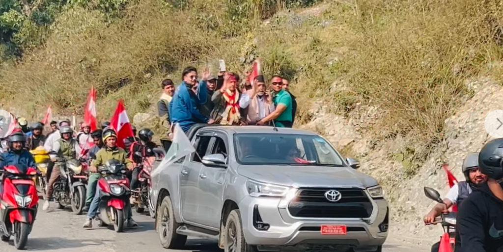 धादिङ । नेपाली कांग्रेस धादिङ क्षेत्र नम्बर २ का प्रतिनिधि सभा सदस्यका उम्मेदवार रमेश प्रसाद धमलाको पक्षमा कांग्रेसले मंगलबार मोटरसाइकल र्याली गरेको छ । आगामी फागुन २१ गते सम्पन्न हुँदै गरेको प्रतिनिधि सभा निर्वाचनको प्रत्यक्ष तर्फका उम्मेदवार रहेका धमला सुधारिएको कांग्रेस २.० को उम्मेदवार हुन् । तर, सुधारिएको भनिएको कांग्रेसको आचारण व्यवहार र रवाफ पुरानै देखिएको छ । गुण्डागर्दी, हप्ता असुली र ज्यानमार्ने मुद्दाका खुंखार अभियुक्त गुण्डा नाइके राधाकृष्ण भण्डारी उर्फ राधेलाई दायाँ तर्फ राखेर धमलाले मंगलबार भव्य र्याली गरेका छन् । उनले आफू चढेको करोड भन्दा बढि मुल्य पर्ने टोयोटा हाइलक्सको दायाँ तर्फ गुण्डा नाइके भण्डारीलाई राखेर र्याली गरेका हुन् ।