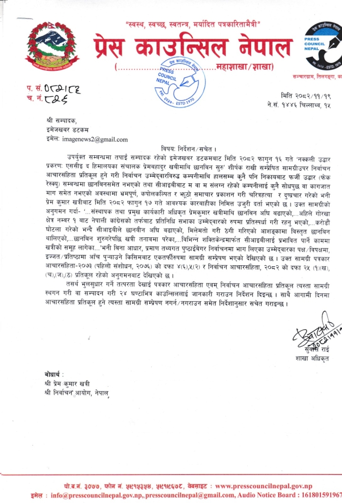 काउन्सिलले फागुन १९ गतेको मितिमा ईमेजखबरलाई निर्देशन दिँदै समाचार हटाउन भनेको छ ।