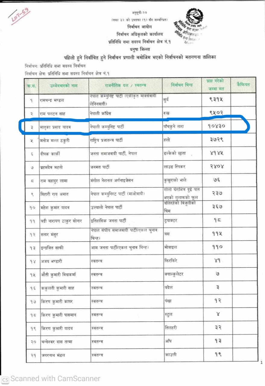 काठमाडौँ । नेपाली कम्युनिष्ट पार्टी (नेकपा)ले धनुषा जिल्ला निर्वाचन क्षेत्र नम्बर १ मा प्रतिनिधि सभा सदस्यका लागि आफ्ना उम्मेदवार मातृकाप्रसाद यादव विजयी भएको मत परिणाम सार्वजनिक भइसके पनि निर्वाचन आयोगले हालसम्म नदिएको भन्दै गम्भीर ध्यानाकर्षण भएको जनाएको छ।