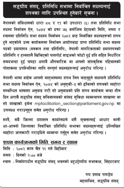 यसैबीच सबै जिल्ला प्रशासन कार्यालयहरूलाई पनि आ–आफ्ना जिल्लाबाट निर्वाचित सांसदहरूलाई उक्त सूचना उपलब्ध गराउन भनिएको छ। संघीय संसद्का महासचिव पद्मप्रसाद पाण्डेयद्वारा जारी सूचनामा शपथ कार्यक्रमलाई व्यवस्थित र मर्यादित बनाउन सबै सदस्यहरूको सक्रिय सहयोग आवश्यक रहने उल्लेख गरिएको छ।