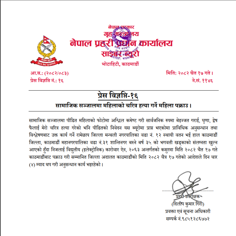 सामाजिक सञ्जालको दुरुपयोग गरी कसैको चरित्र हत्या गर्ने कार्य कानुनतः दण्डनीय हुने व्यहोरा प्रहरीले स्पष्ट पारेको छ ।