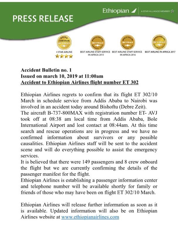 इथोपियन एअरलाइन्सले जहाजमा रहेका १४९ यात्रु र चालक दलका ८ सदस्यको मृत्यु भएको पुष्टि गरेको छ । जहाज विमानस्थलबाट उडेको ६ मिनेटमा नै दुर्घटना भएको हो ।