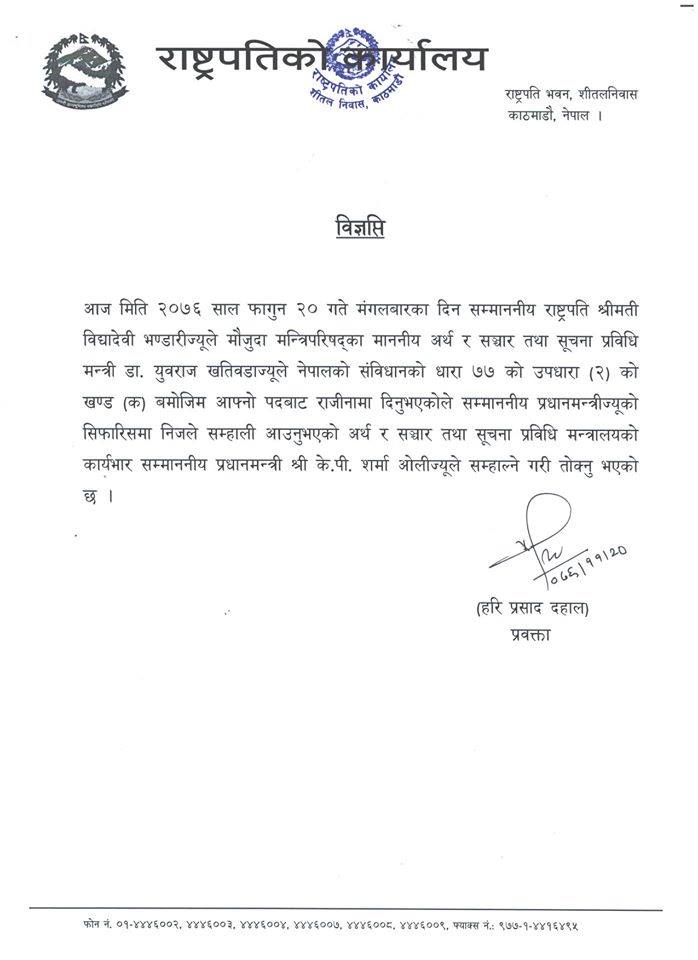 राष्ट्रपति कार्यलयबाट जािर गरिएको विज्ञप्तीका अनुसार खतिवडाले सम्हाल्दै आएको अर्थ मन्त्रालय र संचार तथा सुचना प्रविधि मन्त्रालय अब प्रधानमन्त्रीले सम्हाल्ने छन् ।