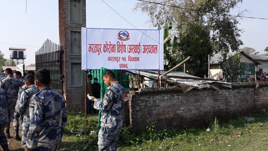 चितवन, चैत ६ । कोरोनाभाइरससँग लड्नका लागि चितवनमा ७० शैय्याको अस्पताल निर्माण सम्पन्न भएको छ । मंगलबारबार बाट निर्माण शुरु गरिएको अस्थायी अस्पताल तीन दिनभित्र निर्माण सम्पन्न भएको हो । चितवन उद्योग संघको प्रदर्शनी केन्द्रमा निर्माण गरिएको अस्थायी अस्पतालको नाम भरतपुर कोरोना बिशेष अस्पताल राखिएको छ ।