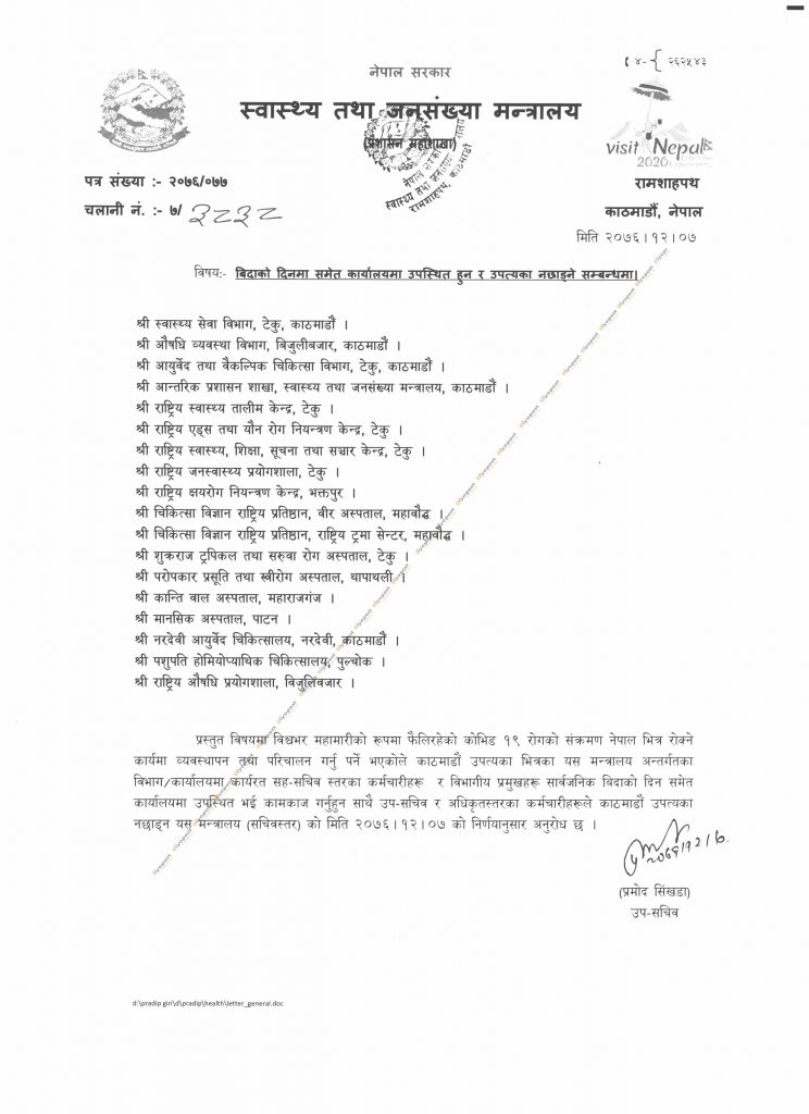 स्वास्थ्य मन्त्रालयले शुक्रबार ती निकायहरुलाई पत्राचार गर्दै विदाको समयमा समेत कार्यालयमा हाजिर हुन भनेको हो ।