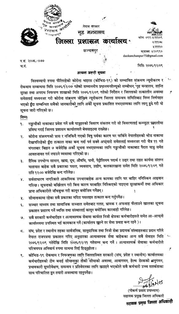 काठमाडौँ। चैत ९ । जिल्ला प्रशासन कार्यलय कञ्चनपुरले कोरोनाभाइरसको संक्रमणबाट जोगिनका लागि जिल्लावासीहरुलाई घरबाहिर निस्कन प्रतिवन्ध लगाएको छ । आइतबार सुचना जारि गर्दै कञ्चनपुरका सहायक प्रमुख जिल्ला अधिकारी गोकर्ण प्रसाद उपाध्यायले आजै राति १२ बजेदेखि लागु हुनेगरि उक्त प्रतिवन्ध लगाइएको जानकारी दिएका छन् ।