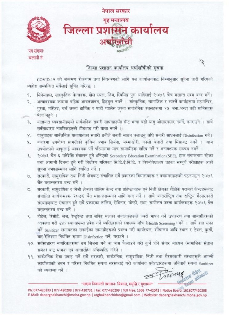 अर्घाखाँची, चैत १० । आज राति १२ बजेबाट अर्को सूचना जारी नभएसम्मका लागि अर्घाखाँची जिल्ला ‘लकडाउन’ हुने भएको छ । कोरोना भाइरस सङ्क्रमणको जोखिमलाई मध्यनजर गर्दै आज जिल्ला प्रशासन कार्यालयमा प्रमुख जिल्ला अधिकारी विजयराज पौडेलको अध्यक्षतामा बसेको सर्वपक्षीय बैठकले जिल्लालाई ‘लकडाउन’ गर्ने निर्णय गरेको हो ।