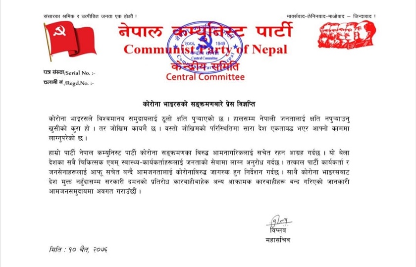 ‘हाम्रो पार्टी नेपाल कम्युनिस्ट पार्टी कोरोना संक्रमणका विरुद्ध आम नागरिकलाई सचेत रहन आग्रह गर्दछ । यो बेला देशको सबै चिकित्सक एवम् स्वास्थ्य–कार्यकर्ताहरुलाई जनताको सेवामा लाग्न अनुरोध गर्दछ । तत्काल पार्टी कार्यकर्ता र जनसेनाहरुलाई आफु सचेत बन्दै आम जनतालाई कोरोना बिरुद्ध जागरुक हुन निर्देशन दिन्छ’ विज्ञप्तीमा भनिएको छ, ‘ साथै कोरोनाभाइरसबाट देश मुक्त नहुँदासम्म सरकारी दमनको प्रतिरोध कारबाही बाहेक अन्य आक्रामक कारबाही हरु बन्द गरिएको जानकारी आम जनसमुदायमाझ अवगत गराउँछौँ ।’