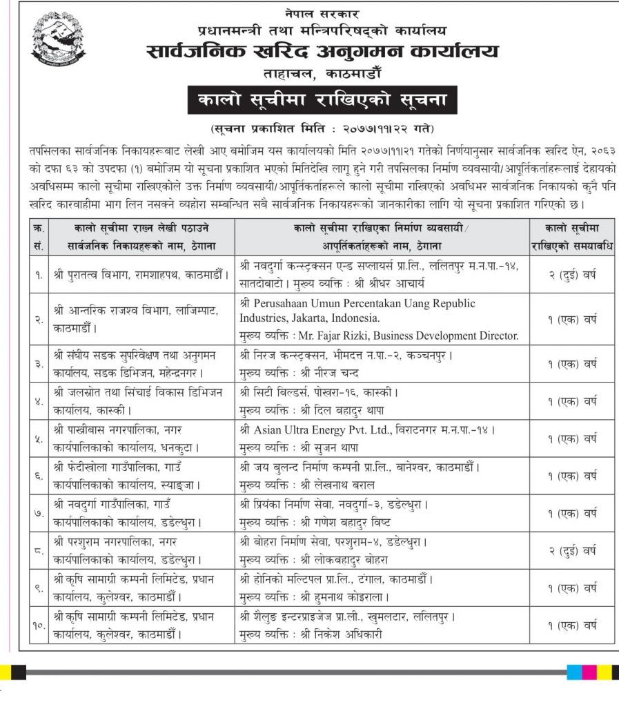 शनिबार गोरखापत्रमा सार्वजनिक सुचना अनुसार १० वटा ठेकेदार कम्पनिलाई एक वर्षका लागि कालोसुचिमा राखेको हो ।