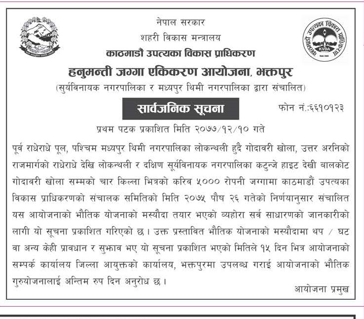 मंगलबार एक दैनिक पत्रिकामा प्राधिकरणले भौतिक योजनाको मस्यौदा तयार भएको र उक्त मस्यौदामा केही उजुरी भए प्राधिकरणको भक्तपुर आयुक्त कार्यालयलाई सुचना दिन भनिएको छ ।