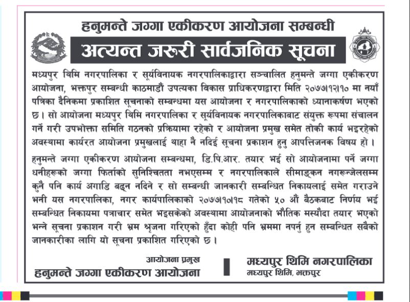 ‘सो आयोजना मध्यपुर थिमि नगरपालिका र सूर्य विनायक नगरपालिकाबाट संयुक्त रुपमा सञ्चालन गर्ने गरि उपभोक्ता समिति गठनका प्रक्रियामा रहेको र आयोजना प्रमुख समेत तोकी कार्य समेत भइरहेको अवस्थामा कार्यरत आयोजना प्रमुखलाई थाहा नै नदिई सुचना प्रकाशन हुनु आपत्तिजनक विषय हो,’ गोरखापत्रमा प्रकाशित सार्वजनिक सुचनामा भनिएको छ,‘हनुमन्ते जग्गा एकिकरण आयोजनाका सम्बन्धमा, डिपिआर नयार भई आयोजनामा पर्ने धनीहरुको जग्गा फिर्ताको सुनिश्चितता नभएसम्म र नगरपालिकाले सिमांकन नगरुञ्जेलसम्म कुनै पनि कार्य अगाडी बढ्न नदिने र सो सम्बन्धी जानकारी सम्बन्धीत निकायलाई समेत जानकारी गराउने भनी यस नगरपािलकाका, नगरकार्यपालिकाको २०७७।१०।१८ गतेको ५० औँ बैठकबाट निर्णय भई सम्बन्धित निकायमा पत्राचार समेत भइसकेको अवस्तामा आयोजनाको भौतिक मस्यौदा तयार भएको भन्ने सुचना प्रकाशन गरी भ्रम श्रृजना गरिएको हुँदा कोही पनि भ्रममा नपर्नु हुन सम्बन्धित सबैमा जानकारीका लागि यो सुचना प्रकाशित गरिएको छ ।’