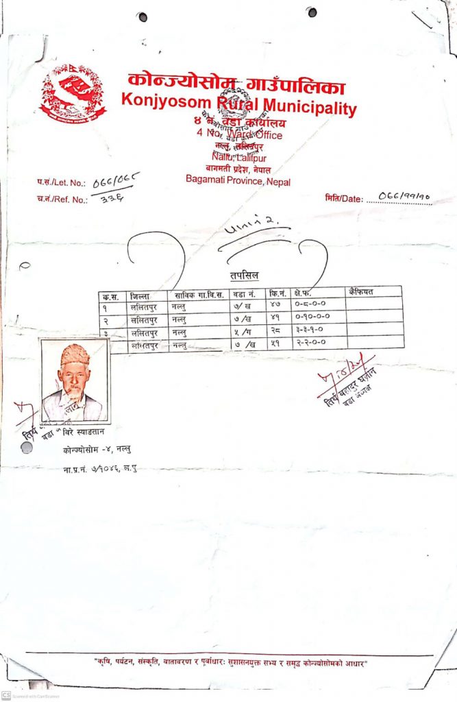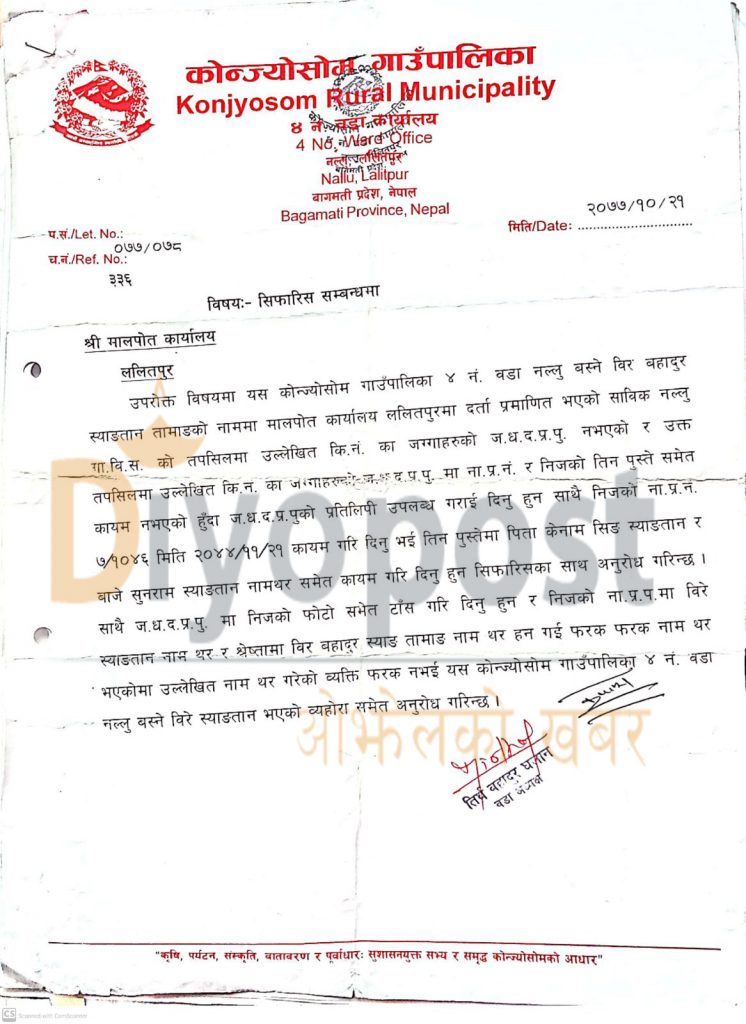 तर अहिले प्रमाणपुर्जा जरुरी भएपछि उनले गत माघमा जग्गाधनी प्रमाणपुर्जा ल्याउन प्रकृया शुरु गरे । सोही अनुसार मघ २१ गते वडा कार्यालयले बिर बहादुर र बिरे एउटै व्यक्ति भएकोले श्रेस्तामा बिर बहादुरको नाममा कायम भएको जग्गा बिरेको नाममा प्रमाणपुर्जा उपलब्ध गराउन वडा कार्यालयले सिफारिस पनि ग¥यो । वडाध्यक्षले गरेको सिफारिसमा बाजे सुनाराम स्याङतानको नाती केनाम सिङ स्याङतानको छोरा २०४४ साल फागुन २१ गते ७/१०४६ नम्बरको नागरिकता नागरिकता लिएका बिरेको नाममा जग्गा कायम गरिदिनु भन्ने उल्लेख छ ।