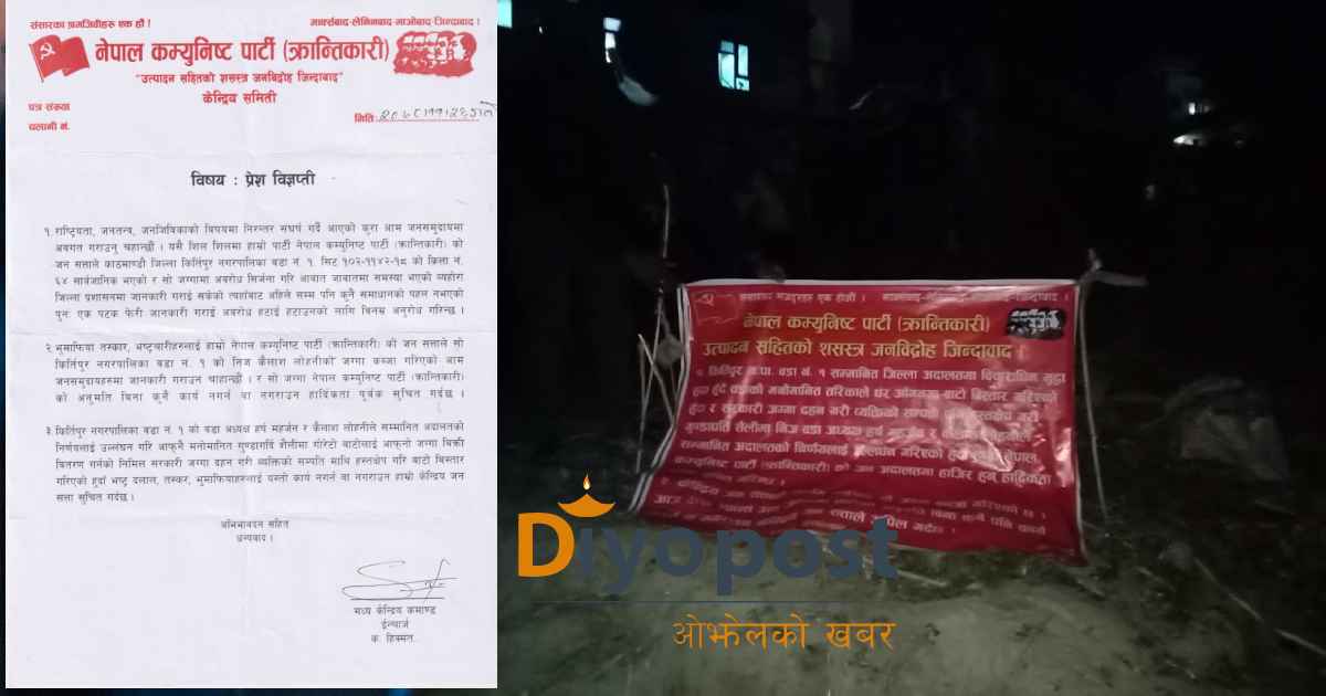 काठमाडौंको किर्तिपुर नगरपालिका वडा नम्बर १ सिट नमबर १०२–१४२–१८ को कित्ता नम्बर ६४ को सार्वजनिक जग्गामा अवरोध गरि आवात जावतमा समेत समस्या बनाएको भन्दै कैलाश लोहोनीको जग्गा कब्जा गरिएको हो । उक्त जग्गामा उक्त पार्टीले पार्टीको झण्डा र ब्यानर टाँसेका छन् ।