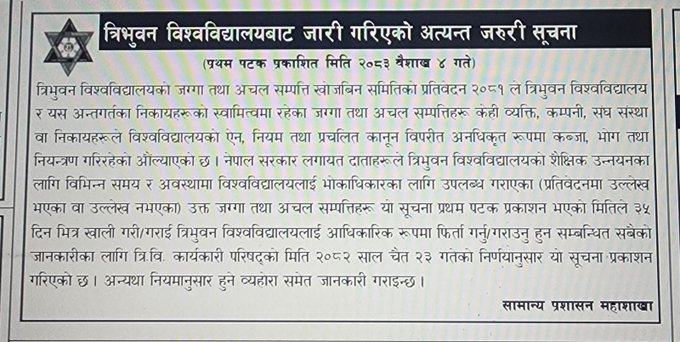 काठमाडौँ । त्रिभुवन विश्व विद्यालयले आफ्नो स्वामित्वमा रहेका जग्गा तथा सम्पत्तिमा भइरहेको अतिक्रमण र अवैध कब्जा हटाउन निर्देशन दिएको छ। विश्वविद्यालयले एक सूचना जारी गर्दै त्यस्ता सम्पत्ति ३५ दिनभित्र स्वेच्छिक रूपमा फिर्ता गर्न आग्रह गरेको हो।