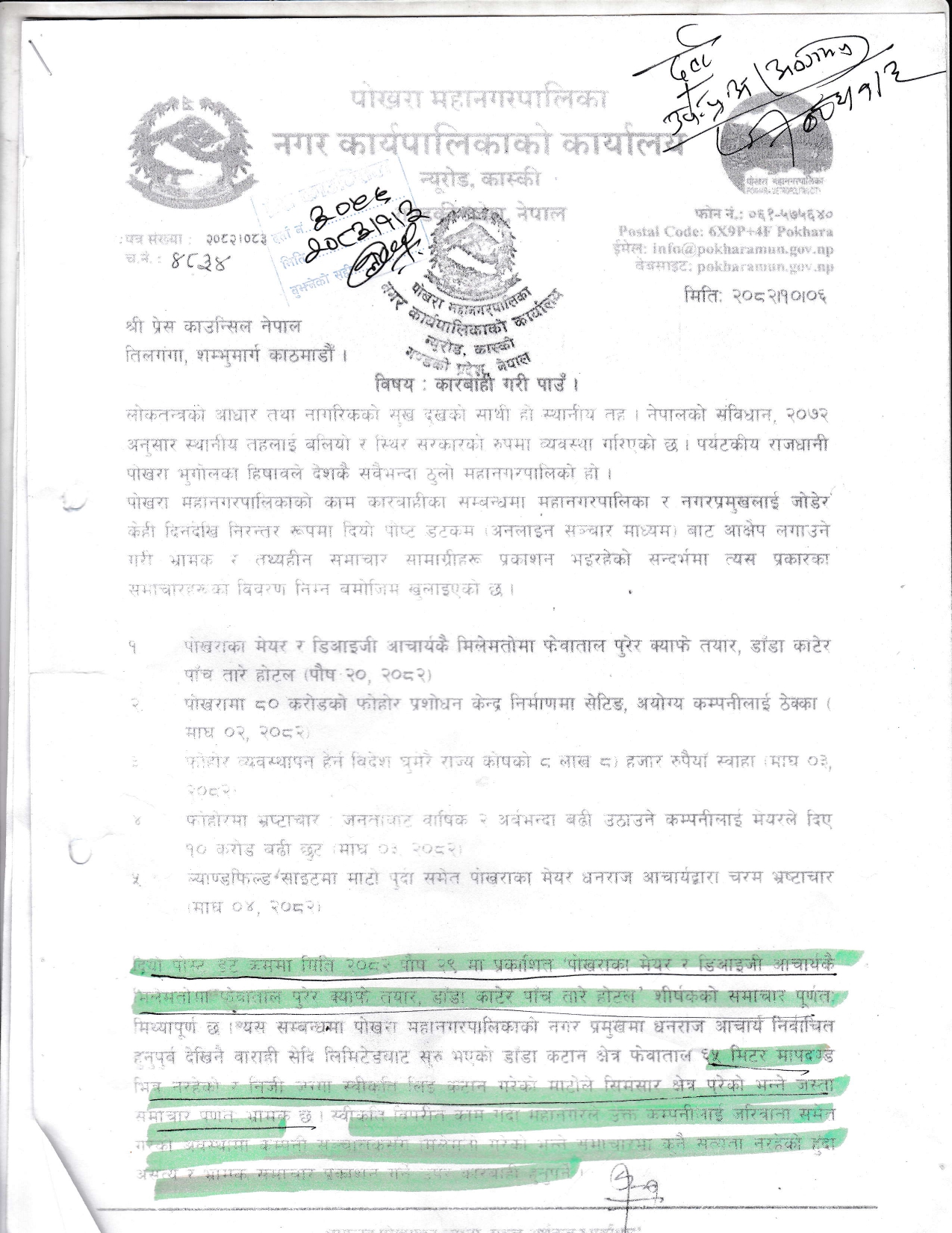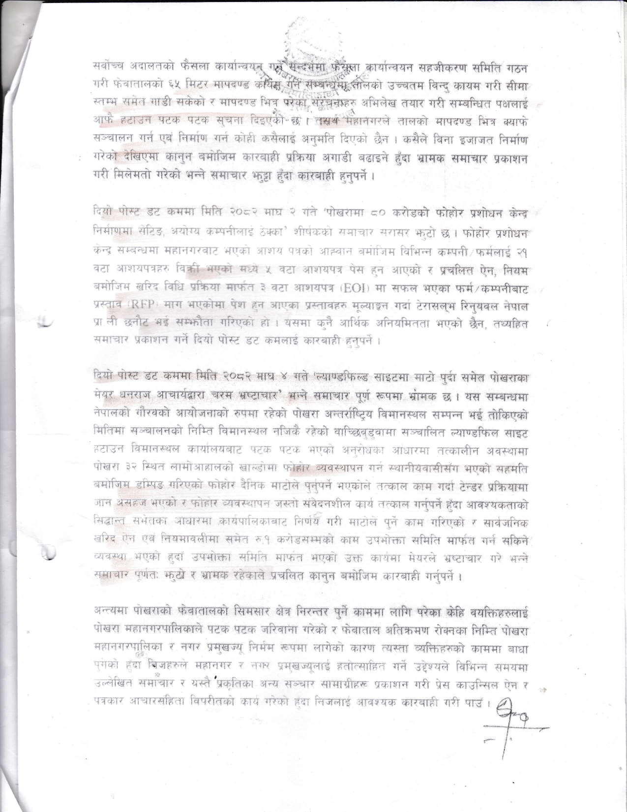 काठमाडौं । पोखरा महानगरपालिकाले दियोपोस्टमा प्रकाशित समाचारको खण्डन गरेको छ । पौष २० गते प्रकाशित ‘पोखरामा मेयर र डिआइजी आचार्यकै मिलेमतोमा फेवाताल पुरेर क्याफे तयार, डाँडा काटेर पाँच तारे होटल’ शिर्षकको समाचारसहित विभिन्न ५ वटा शिर्षकमा प्रकाशित समाचारको करिब ४ महिनापछि प्रेस काउन्सिल नेपाल मार्फत खण्डन गरिएको हो ।