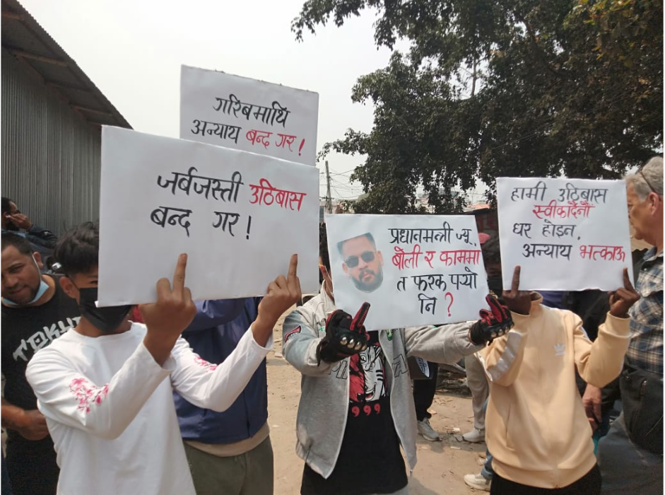 उनीहरुले बिहानैदेखि बिभिन्न नारा लेखिएका प्लेकार्डसहित प्रदर्शन गरिरहेका छन् । गरिब माथि अन्याय बन्द गर ! जर्वजस्ती उठिबास बन्द गर ! प्रधानमन्त्री ज्यू, बोली र काममा फरक पर्यो नि ! हामी उठीबास स्वीकार गर्दैनौँ, घर होइन अन्याय भत्काउ ! जस्ता नारा लेखेका प्लेकार्ड प्रदर्शन गरिरहेका छन् ।