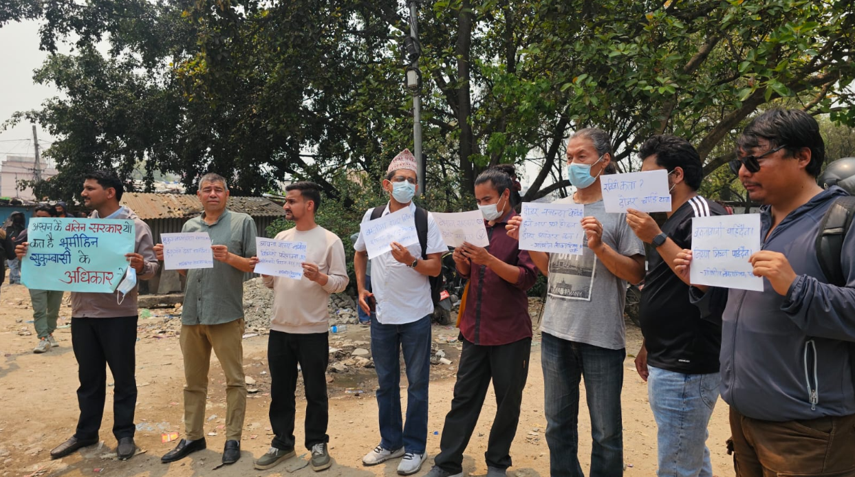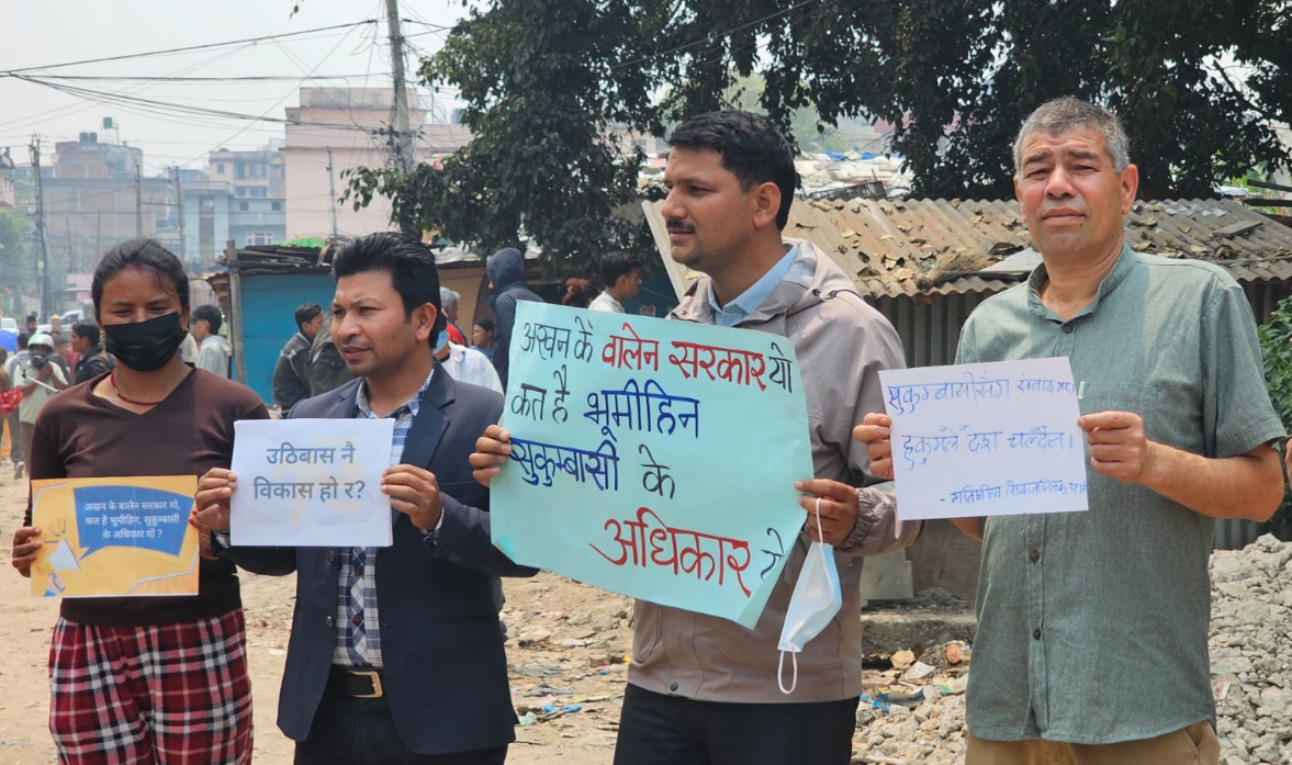 काठमाडौं । थापाथलीस्थित सुकुमबासी बस्तीमा शुक्रबार बिहानैदेखि तनावपूर्ण अवस्था सिर्जना भएको छ। सरकारले सो क्षेत्रका सुकुमबासीहरुलाई हटाउने तयारी गरेसँगै स्थानीयवासीले विरोध प्रदर्शन गरेका हुन्।
