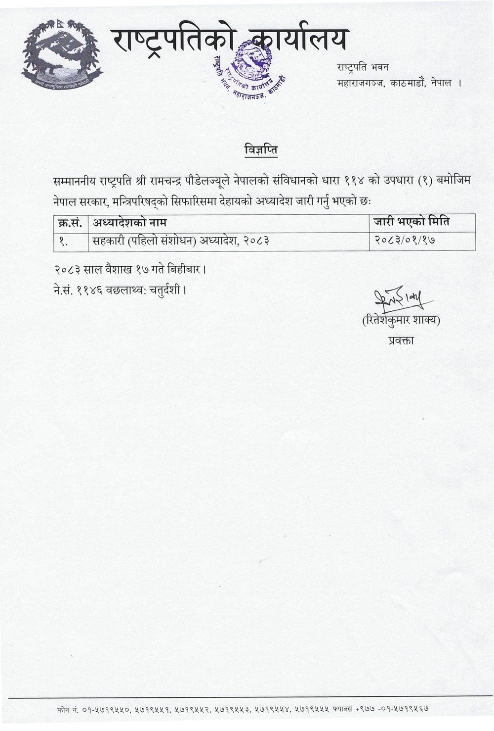 राष्ट्रपति कार्यालयका प्रवक्ता रितेशकुमार शाक्यका अनुसार नेपालको संविधानको धारा ११४ को उपधारा (१) बमोजिम मन्त्रिपरिषद्को सिफारिसमा बिहीबार उक्त अध्यादेश जारी गरिएको हो।