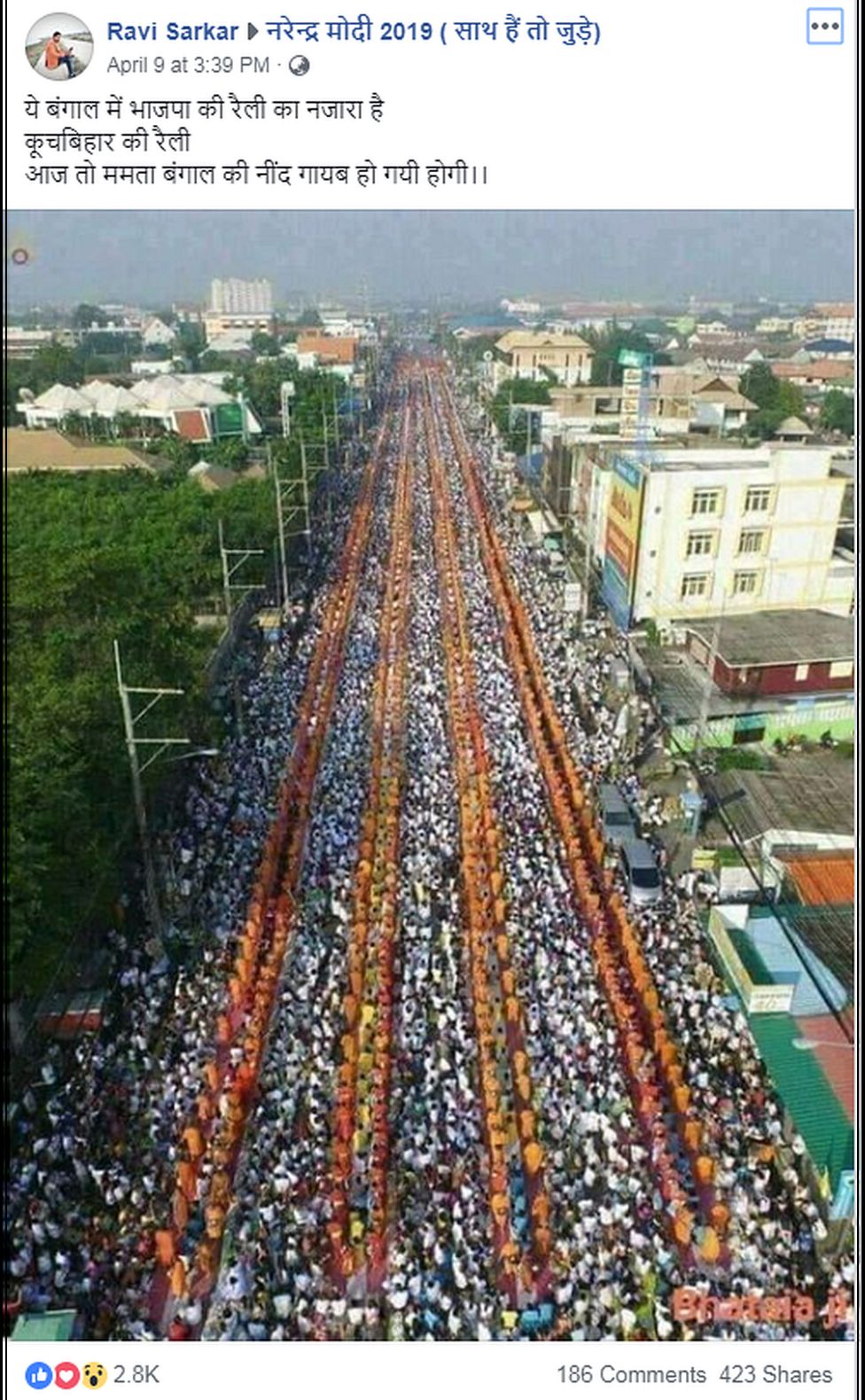 भारतमा निर्वाचन पश्चात मतगणनाका कार्यहरु अगाडी बढ्दै गर्दा यस्तै तस्वीरहरु सामाजिक संञ्जालहरु छरपस्ट भएका छन् । यतिखेर भारतीय प्रधानमन्त्री नरेन्द्र मोदीको समर्थनमा सडकमा उत्रिएका जनताहरुको भिड भन्दै भ्रामात्मक तस्वीरहरु सामाजिक संजालहरुमा भाइरल भएका छन् । बौद्ध भिक्षु र करिब २ किलोमिटर सम्म भनिएको लाम नरेन्द्र मोदीको पश्चिम बंगालमा भएको चुनावी जनसभा बताएर सेयर गरिँदैछ ।