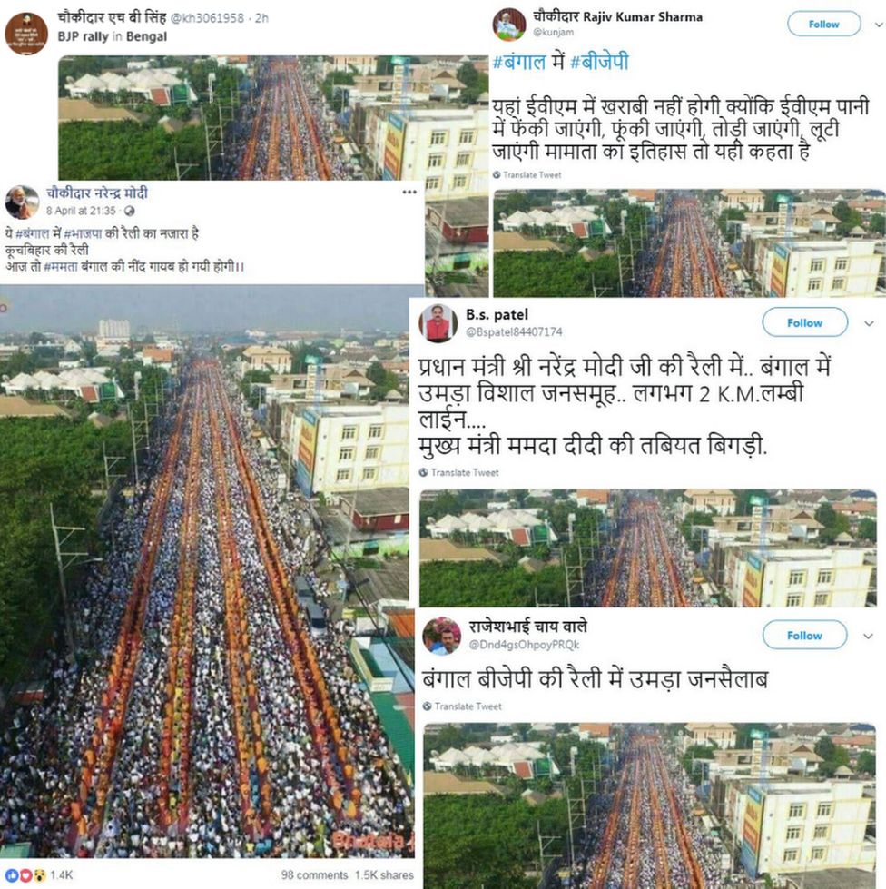 पश्चिम बंगालको कूच बिहारमा मोदीले ७ अप्रिल २०१९ मा चुनावी जनसभा गरेका थिए । तर रिवर्स इमेज सर्चबाट पत्ता लागेअनुसार जुन भाइरल तस्बिरलाई मोदीको –याली बताइएको छ त्यसलाई सन् २०१५ मा पहिलो पटक इन्टरनेटमा अपलोड गरिएको थियो ।