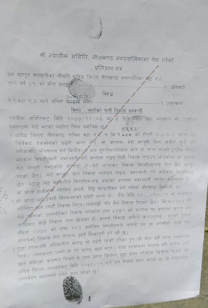गत २८ भदौमा न्यायिक समितिमा दर्ता गरिएको उजुरीमा भनिएको छ, ‘कसैको हकवा स्वामित्वमा भएपनि २८–३० वर्षदेखि पानीको पाइप निकासामा सबै घरधुरीको धाराबाट निस्कने भाँडा माझ्दा, नुहाइ धुवाइ गर्दा र आकाशको पानी पर्दा कित्ता नम्बर ४७६४ जग्गाबाट पानीको निकास हुँदै कित्ता नम्बर २६४३ मा निकासा भइरहेकोमा हाल उक्त पाइप पुरानो भई नयाँपाइप बिछ्याएपछि कित्ता नं. २६४३ को जग्गाधनीले उक्तपाइप काटेर फालिदियो ।’