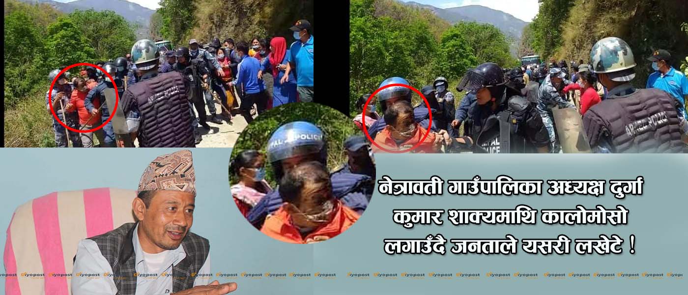 धादिङ, ८ वैशाख । धादिङको नेत्रावती डबजोङ गाउँपालिका अध्यक्ष दुर्गा कुमार शाक्यलाई स्थानियबासीले कालोमोसो लगाएका छन् । वडा नम्बर १ स्थित कैचले बजारमा लामो समयदेखि बस्दै आएका केही व्यक्तिको घर टहरा भत्काउन डोजरसहित पुगेका शाक्यलाई स्थनियबासीले भ्याकुर्खेदाई गरेका हुन् । प्रहरीको घेरामा सुरक्षित भाग्ने कोशिस गरेपनि उनलाई जनताले कालो मोसो लगाइदिएको तस्विर दियोपोस्टले फेला पारेको छ ।