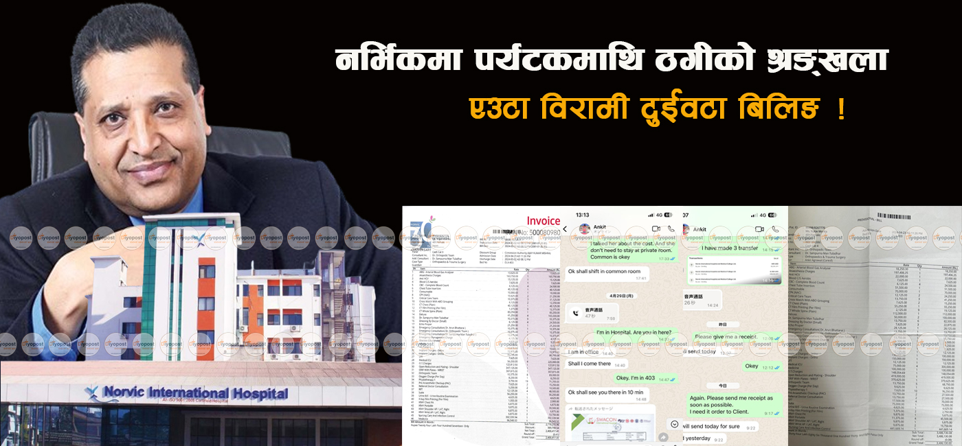 काठमाडौं । नेपाल घुम्न आएकी जापानी आरोहिमाथि ‘ठगी’ गर्न नर्भिक इन्टरनेसनल अस्पतालले दुई वटा बिल (डबल बिलिङ) बनाएको तथ्य बाहिरिएको छ । आरोहणको क्रममा लडेर घाइते भएकी जापानी आरोहिको एउटै उपचार सेवा उपलब्ध गराएबापत छुट्टाछुट्टै मितिमा छुट्टाछुट्टै रकमको बिल बनाएको तथ्य बाहिरिएको हो ।