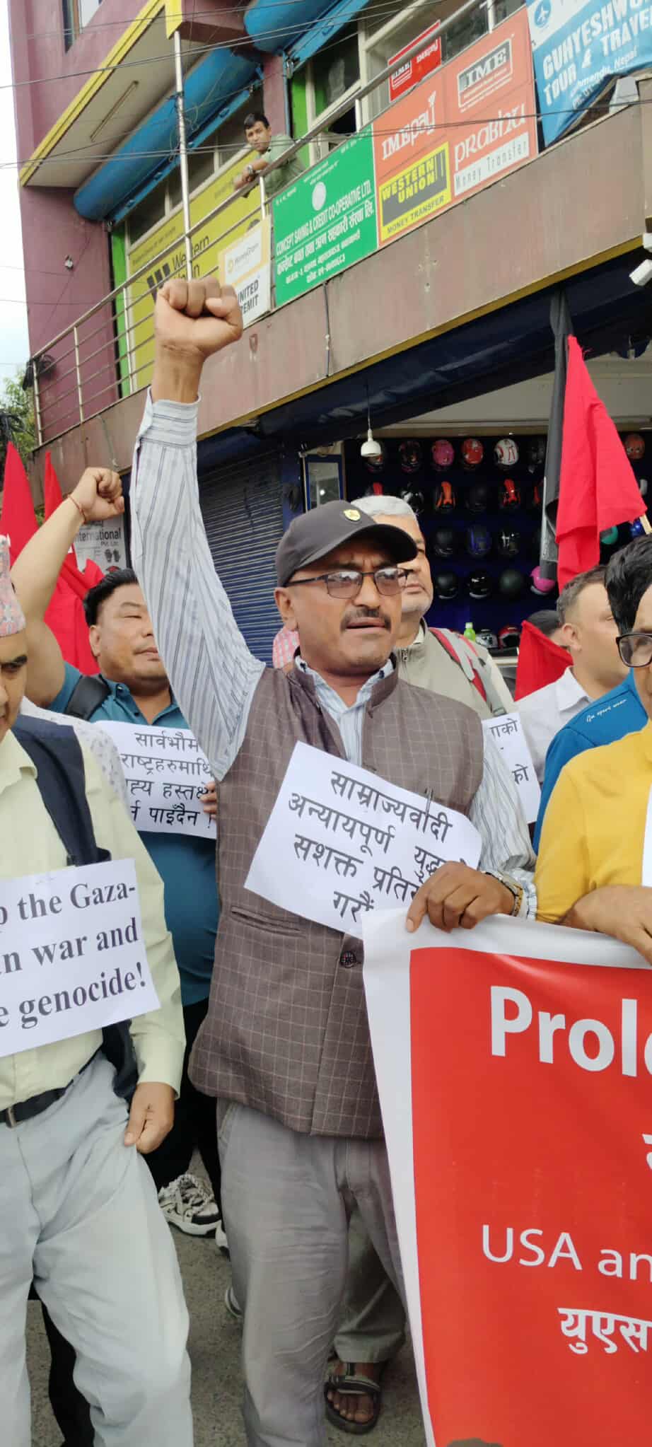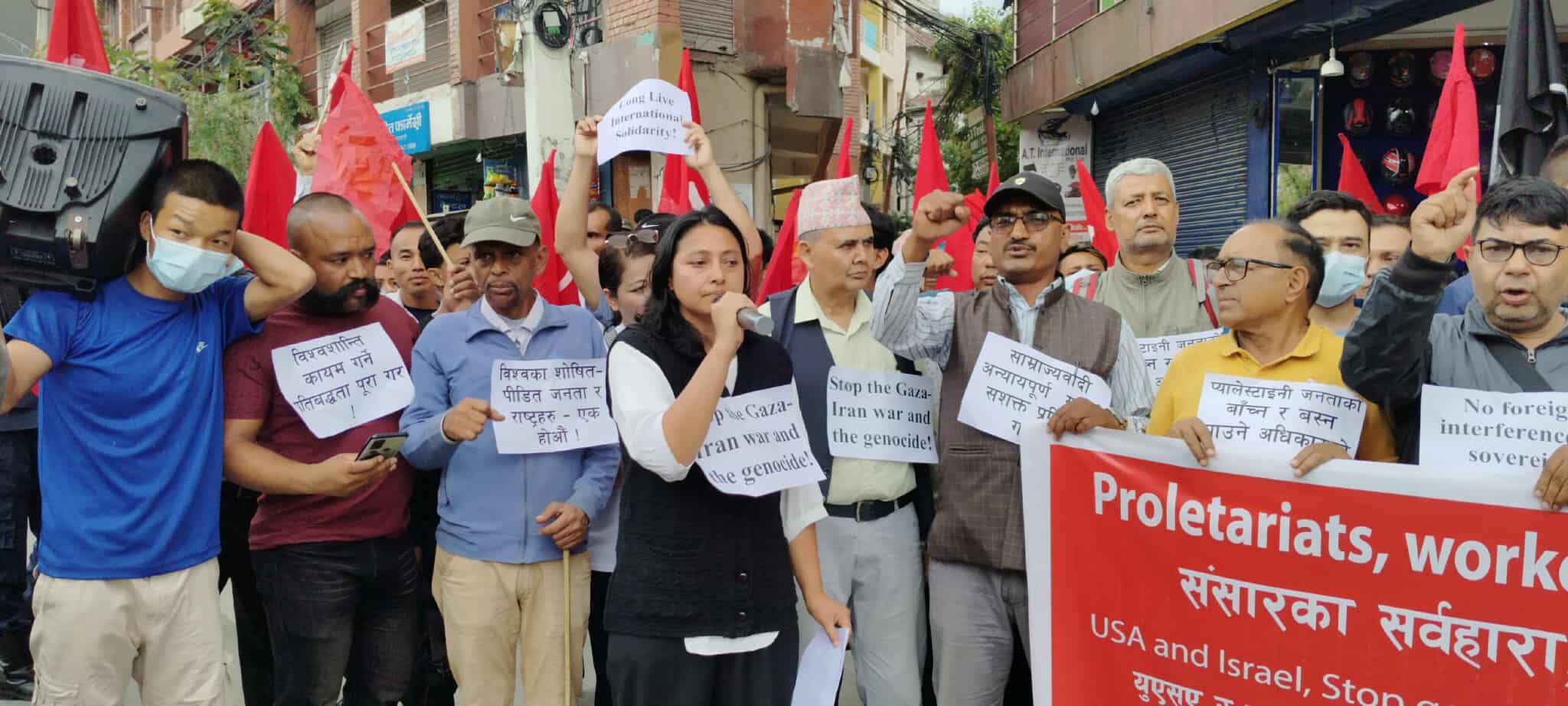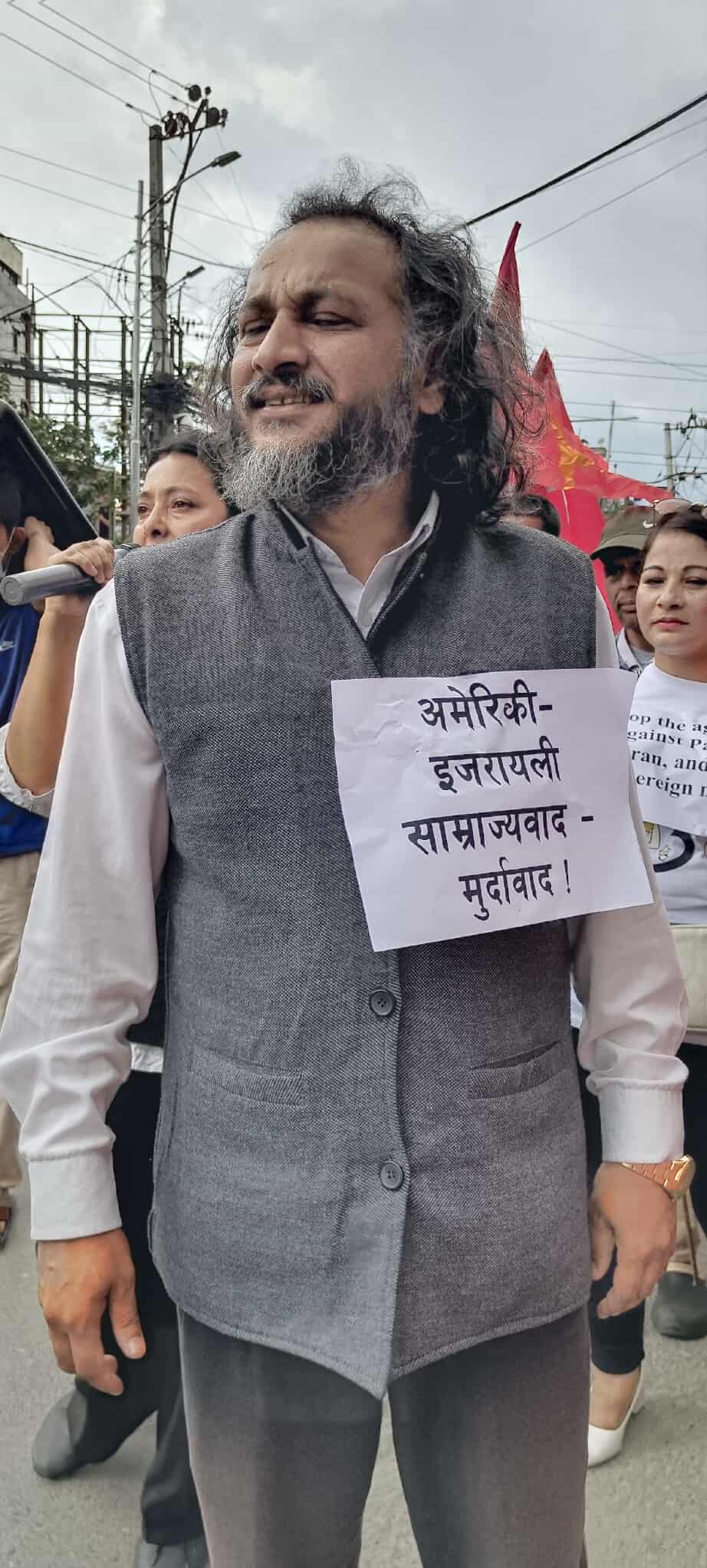 काठमाडौँ । अमेरिका र इजराइलले प्यालेस्टाइन, इरन र छिमेकी मुलुक बिरुद्ध अन्यायपूर्ण र आपराधिक हमला गरेको भन्दै नेपालमा त्यसको बिरोध गरिएको छ । बिश्वमा शान्ति कायम गरिनु पर्ने लगायत प्यालेस्टाइनी जनताको बाँच्न पाउने अधिकारको माग गर्दै आज महाराजगंजस्थित अमेरिकी राजदुताबास अगाडी शक्ति प्रदर्शन गरेका हुन् ।