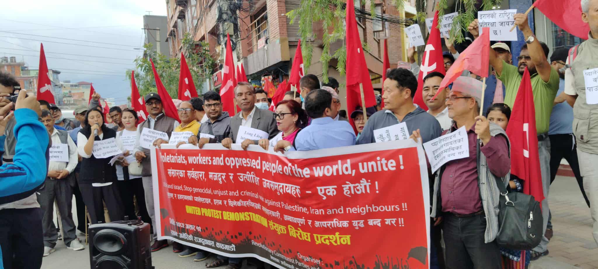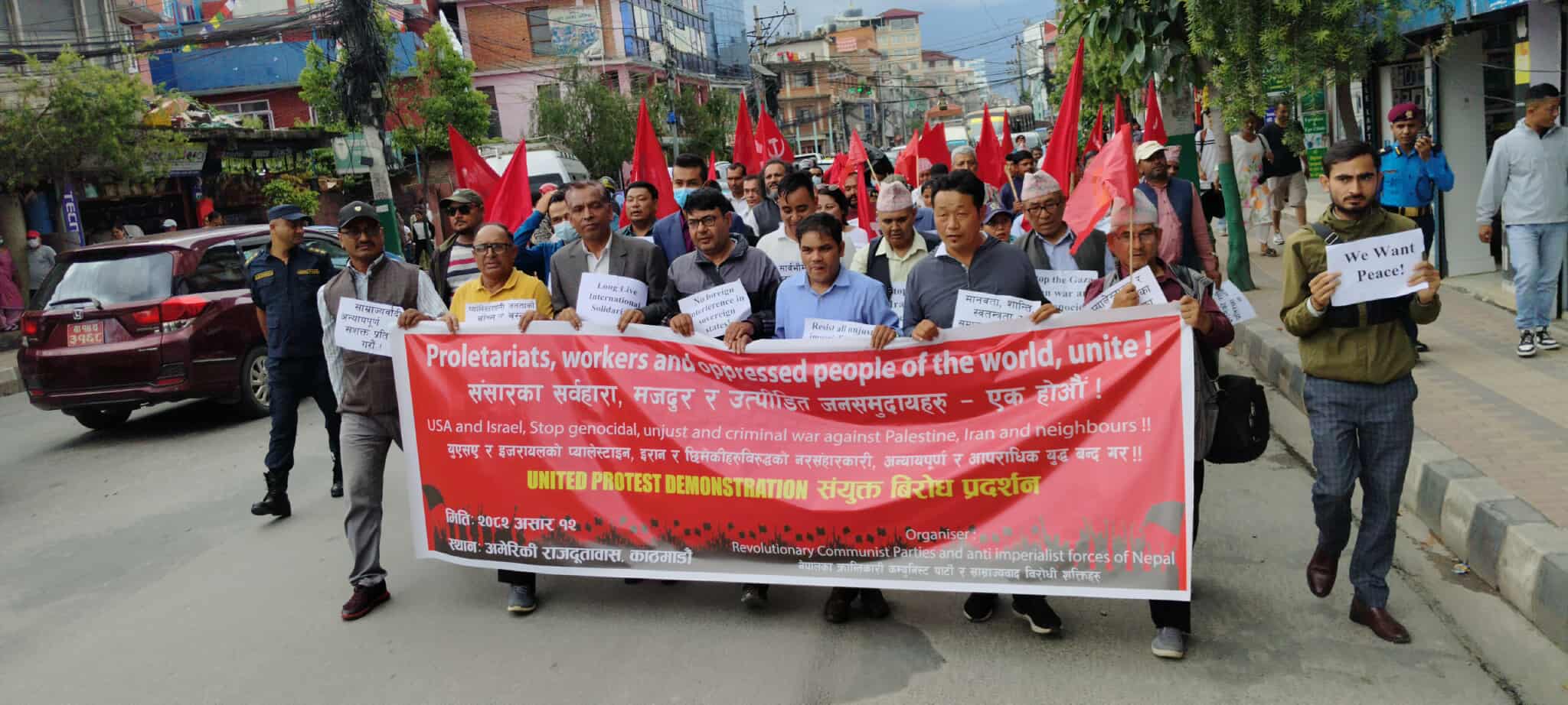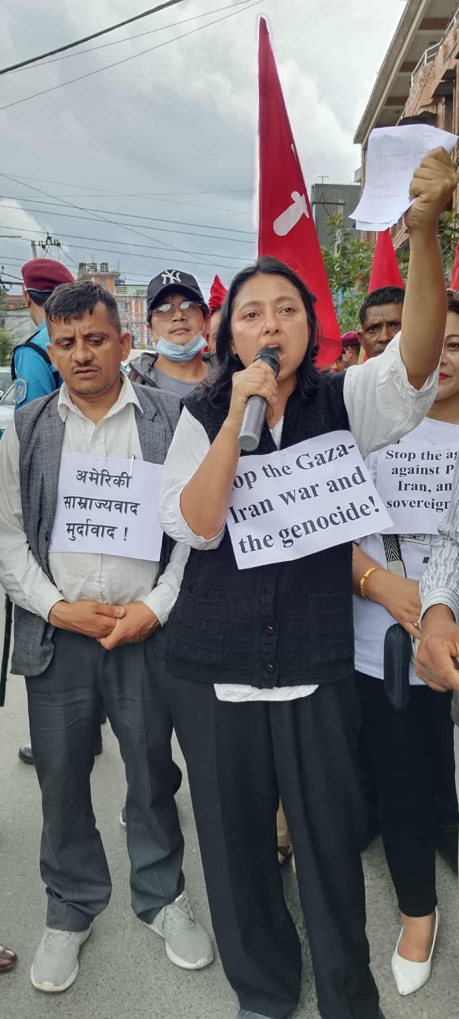 नेपालका क्रान्तिकारी कम्युनिष्ट पार्टी र साम्राज्यवाद बिरोधी शक्तिहरुले अमेरिकी दुताबास अगाडी प्रर्दन गर्दै अमेरिकी र इजराइली आक्रमण तुरुन्तै रोक्नु पर्ने माग राखेका छन् ।