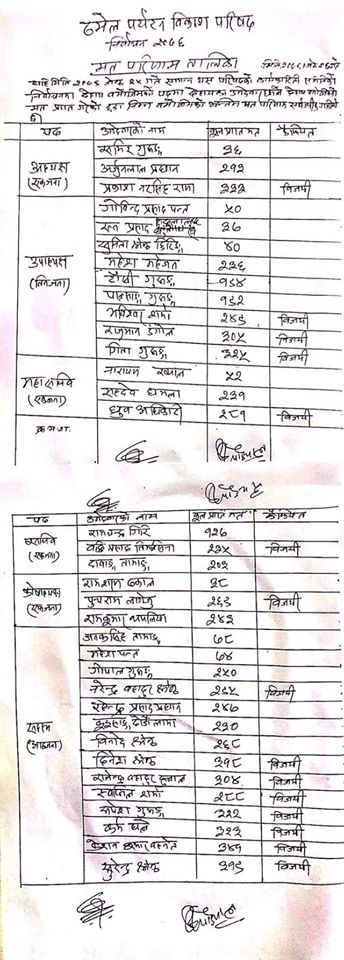 बरिष्ठ उपाध्यक्ष पदमा पनि रानाभाट समुहकै भविश्वर शर्मा विजयी भएका छन् । त्यस्तै राजुमान डंगोल र गिता गुरुङ पनि उपाध्यक्षमा निर्वाचित भएका छन् ।