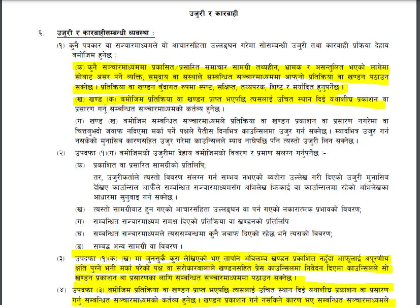त्यस्तै आचार संहिताकै सोही खण्ड अन्तर्गत (३) उपदफा (१)(क) (ख) मा जुनसुकै कुरा लेखिएको भए तापनि अविलम्ब खण्डन प्रकाशित नहुँदा आफूलाई अपूरणीय क्षति पुग्ने भनी मर्का परेको पक्ष वा सरोकारवालाले खण्डनसहित प्रेस काउन्सिलमा निवेदन दिएमा काउन्सिलले सो खण्डन प्रकाशन वा प्रसारणका लागि सम्बन्धित सञ्चारमाध्यममा पठाउन सक्ने’ उल्लेख छ ।