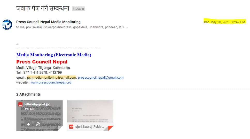 दियोपोस्टको इमेलमा काउन्सिलले सन् २०२१ मे २० को दिउँसो १२ बजेर ४२ मिनेटमा जवाफ माग्दै पत्र लेखेको थियो । सोही पत्र एक घण्टा भित्रै अर्थात १ बजेर २७ मिनेटमा ‘साइबर सेना’ले धम्कीपूर्ण भाषा प्रयोग गर्दै पोस्ट गरेको देखिन्छ ।