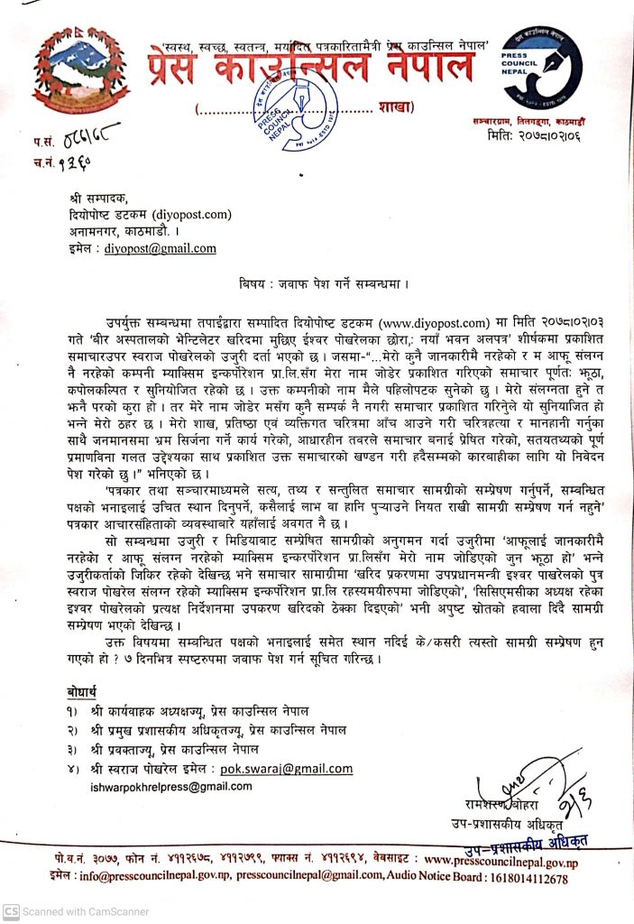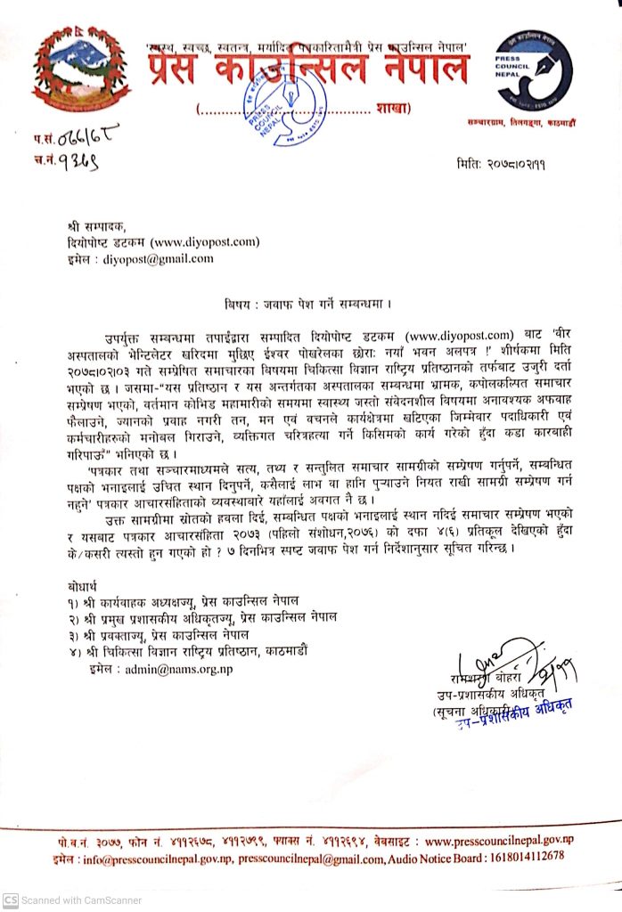 काउन्सिलले पठाएको पत्रमा जवाफ मात्रै मागिएको छैन दियोपोस्टमा प्रकाशित समाचार अपुष्ट स्रोतको हवाला दिएर सामग्री सम्प्रेषण गरेको ठहर नै पो गरेको छ । जबकी समाचार पुष्टि भएर नै वीर अस्पतालले खरिद प्रक्रिया नै रद्द गरिसकेको थियोे । ९ जेठमा कान्तिपुर दैनिकमा टेन्डर आह्वानको सुचना नै प्रकाशन गरिसकेको थियो ।