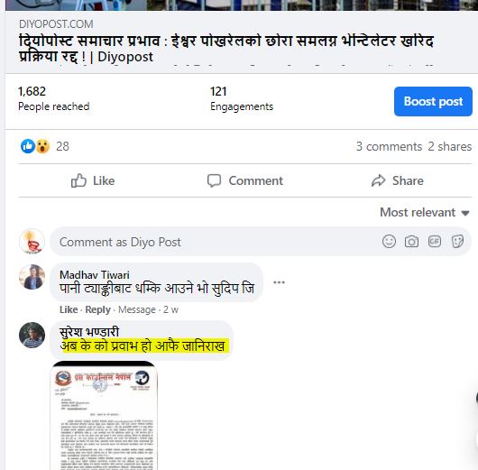 दियोपोस्टको समाचार प्रभावले खरिद प्रक्रिया रद्द भएको प्रकाशित समाचारको कमेन्ट बक्समा सुदेश भण्डारी नाम गरेका व्यक्तिले ‘अब के को प्रभाव हो, आफै जानिराख्’ भन्दै प्रेस काउन्सिलले पठाएको पत्र पोस्ट गरिएको छ । एउटा सञ्चारमाध्यमसँग आचार संहिताको उलंघन गर्दै पत्राचार गर्नु र उक्त पत्र एकाएक साइबर सेनाको हातमा पुग्नुमा के–कस्तो तालमेल हो काउन्सिलकै अधिकारीहरु जवाफदेही बन्नुपर्छ ।