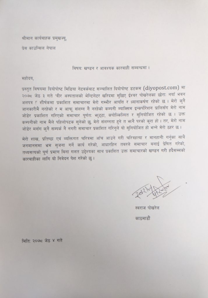 तर, पोखरेल सम्बन्धित सञ्चार माध्यममा सम्पर्क नगरि सिधै प्रेस काउन्सिलमा उजुरी गर्न पुगे । चार जेठमा कार्यबाहक अध्यक्ष गोपाल बुढाथोकीलाई सम्बोधन गरेर उनले दिएको उजुरीमा समाचारको खण्डन गरिदिन र कारबाही गरिदिन माग छ ।