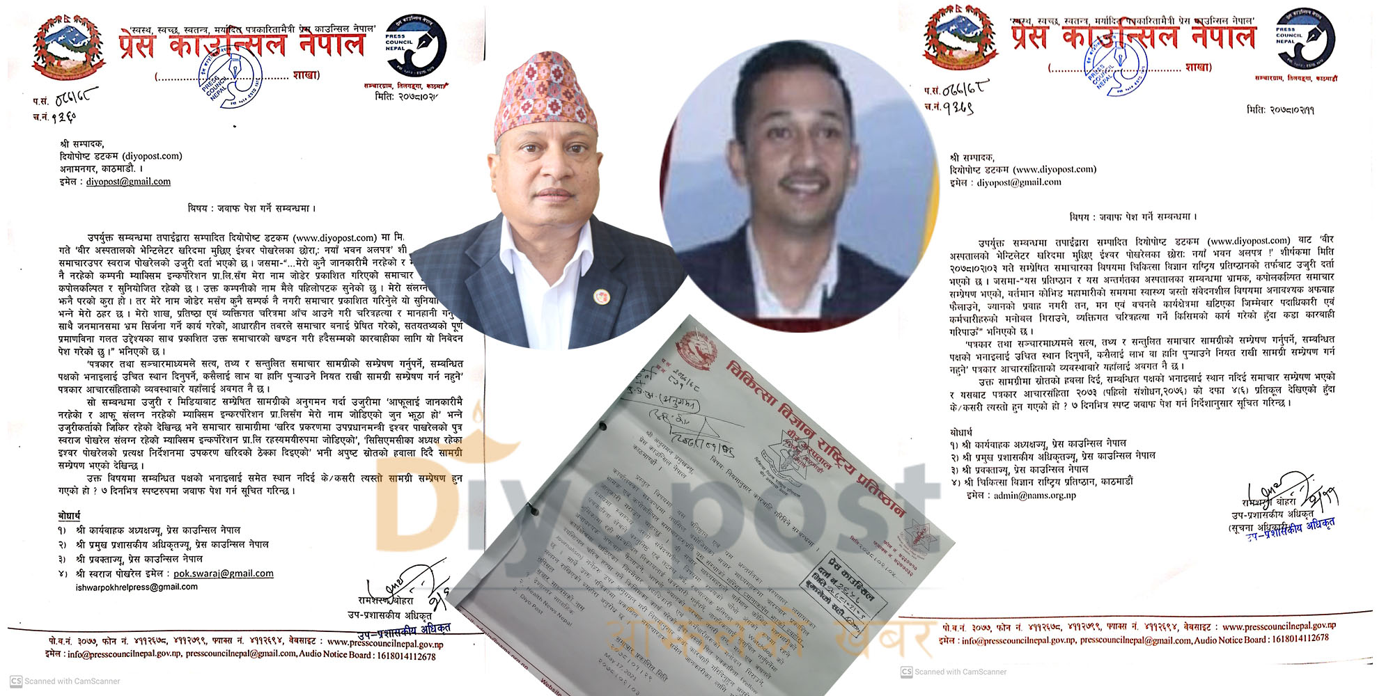 यद्धपी जिम्मेवार सञ्चार माध्यमको हिसाबले काउन्सिलले तोकेको म्याद भित्रै दियोपोस्ट डटकमले जवाफ पठायो । तर, जवाफ दिएको केही दिनमै सोही समाचारलाई लिएर काउन्सिलले अर्को पत्र पठायो । समाचार ईश्वर पोखरेलको छोरासँग सम्बन्धित थियो । तर, उजुरी भने समाचारमा नाम र समलग्नता नै नरहेका चिकित्सा विज्ञान राष्ट्रिय प्रतिष्ठानका उपकुलपति डिएन साहले गरेका रहेछन् । काउन्सिलले एक पटक जवाफ मागिसकेको विषयमा फेरी अर्को उजुरी लिएको थियो । उक्त उजुरीपछि काउन्सिलले जवाफ दिन भन्दै अर्को ७ दिने पत्र फेरी दियोपोस्टलाई काटेको हो । यसको जवाफ पनि दियोपोस्टले दिइसकेको छ ।