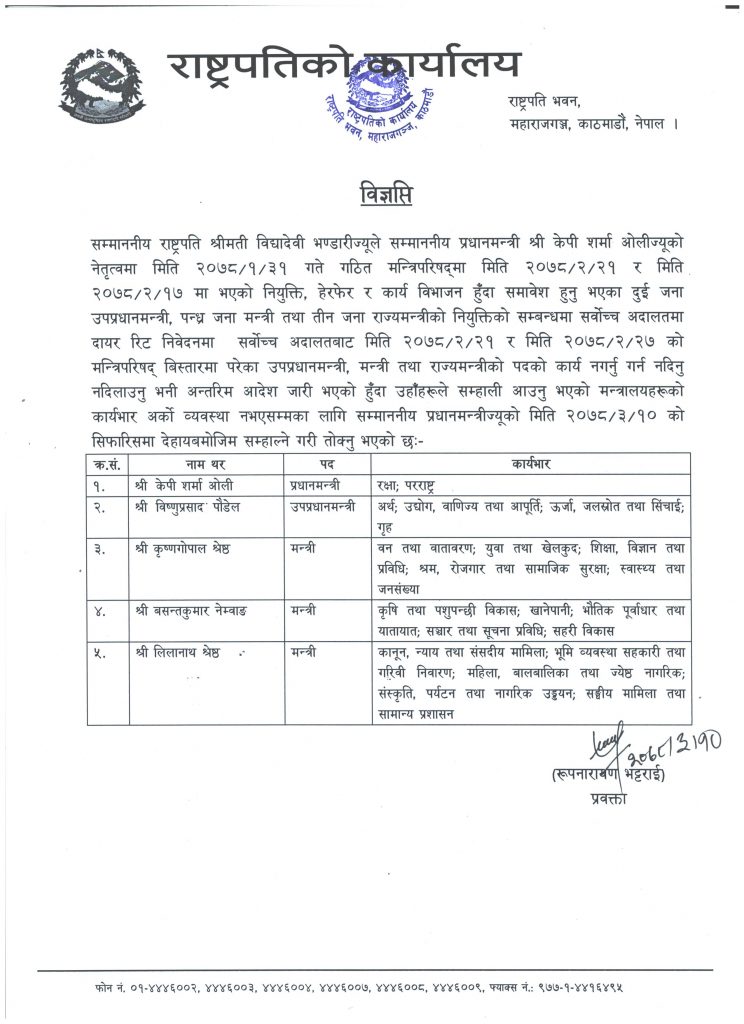 यसैगरी लीलानाथ श्रेष्ठले कानुनसहित भूमि व्यवस्था, महिला तथा जेष्ठ नागरिक, पर्यटन र संघीय मामिला तथा सामान्य प्रशासन मन्त्रालयको जिम्मेवारी सम्हाल्नेछन् । अन्य रिक्त मन्त्रालय भने प्रधानमन्त्री आफैले सम्हाल्नेछन् ।